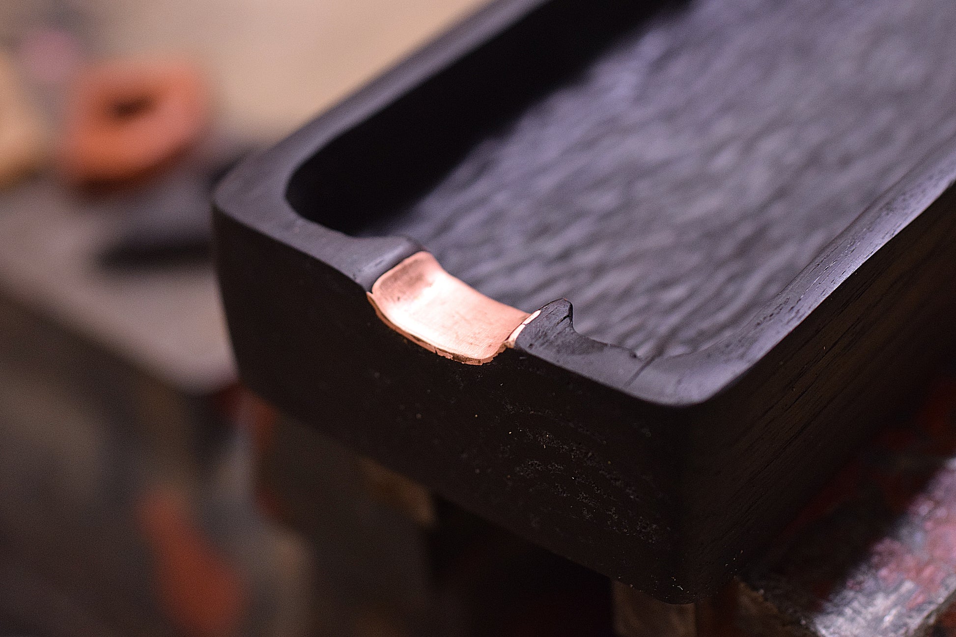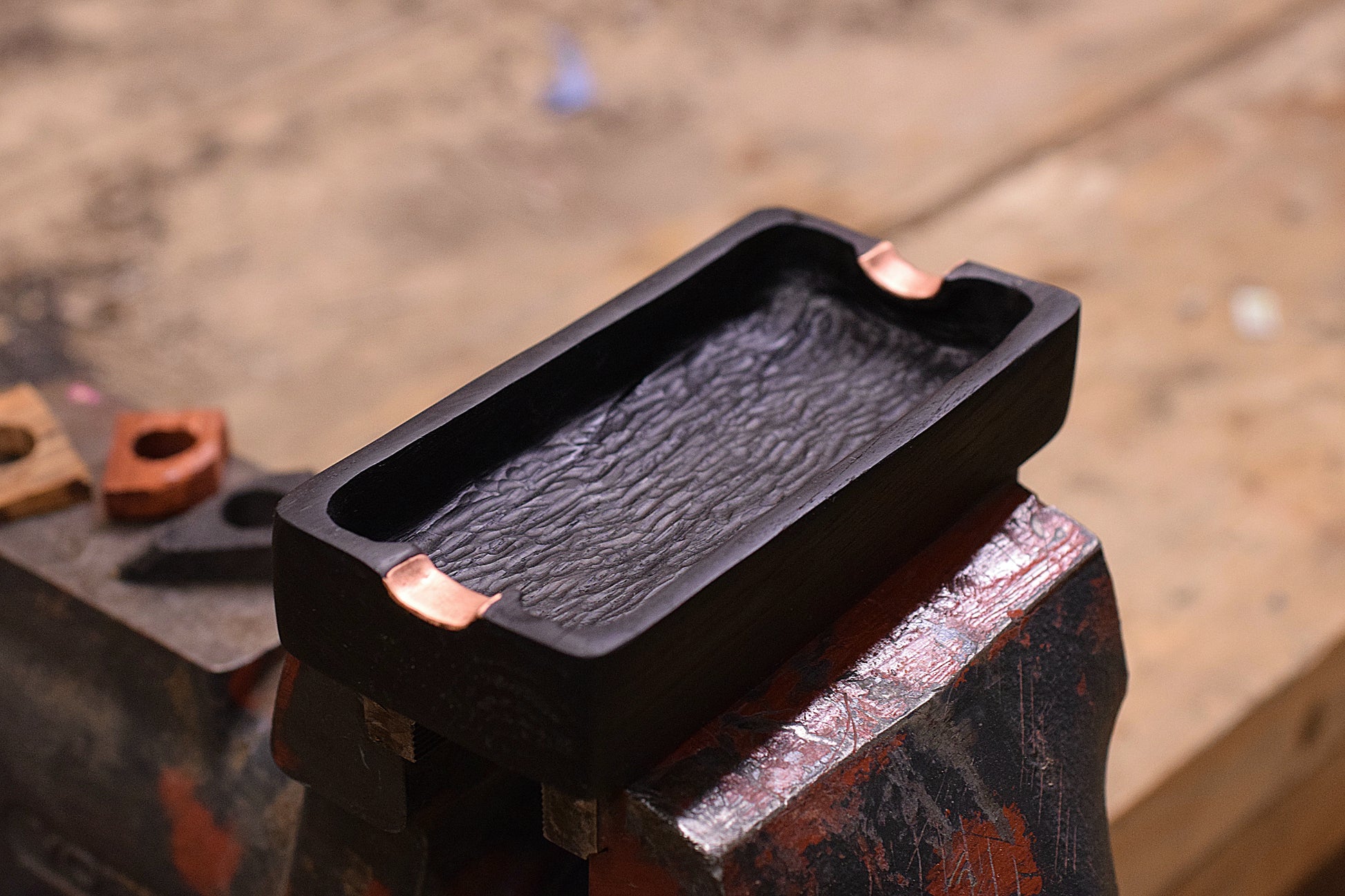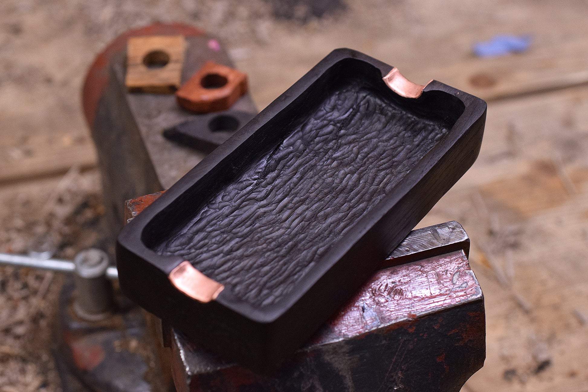 Ova ručno izrađena drvena pepeljara izrađena od močvarnog hrasta - abonosa ističe prirodni karakter i boju materijala, ukrašena raznim teksturama te bakrenim detaljima i urezima za odlaganje cigarete. Abonos je idealno drvo za izradu pepeljara, zbog svoje tvrdoće i otpornosti na visoke temperature.