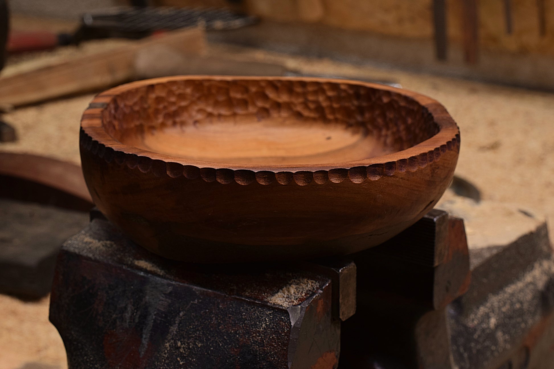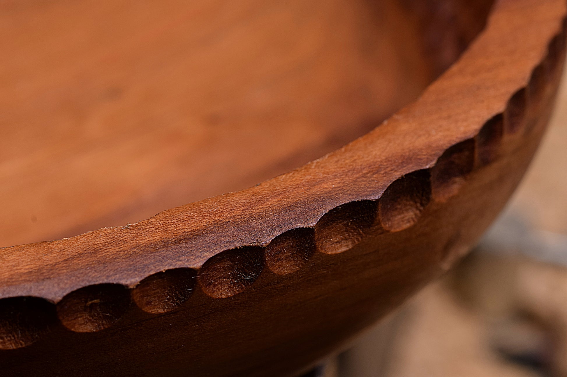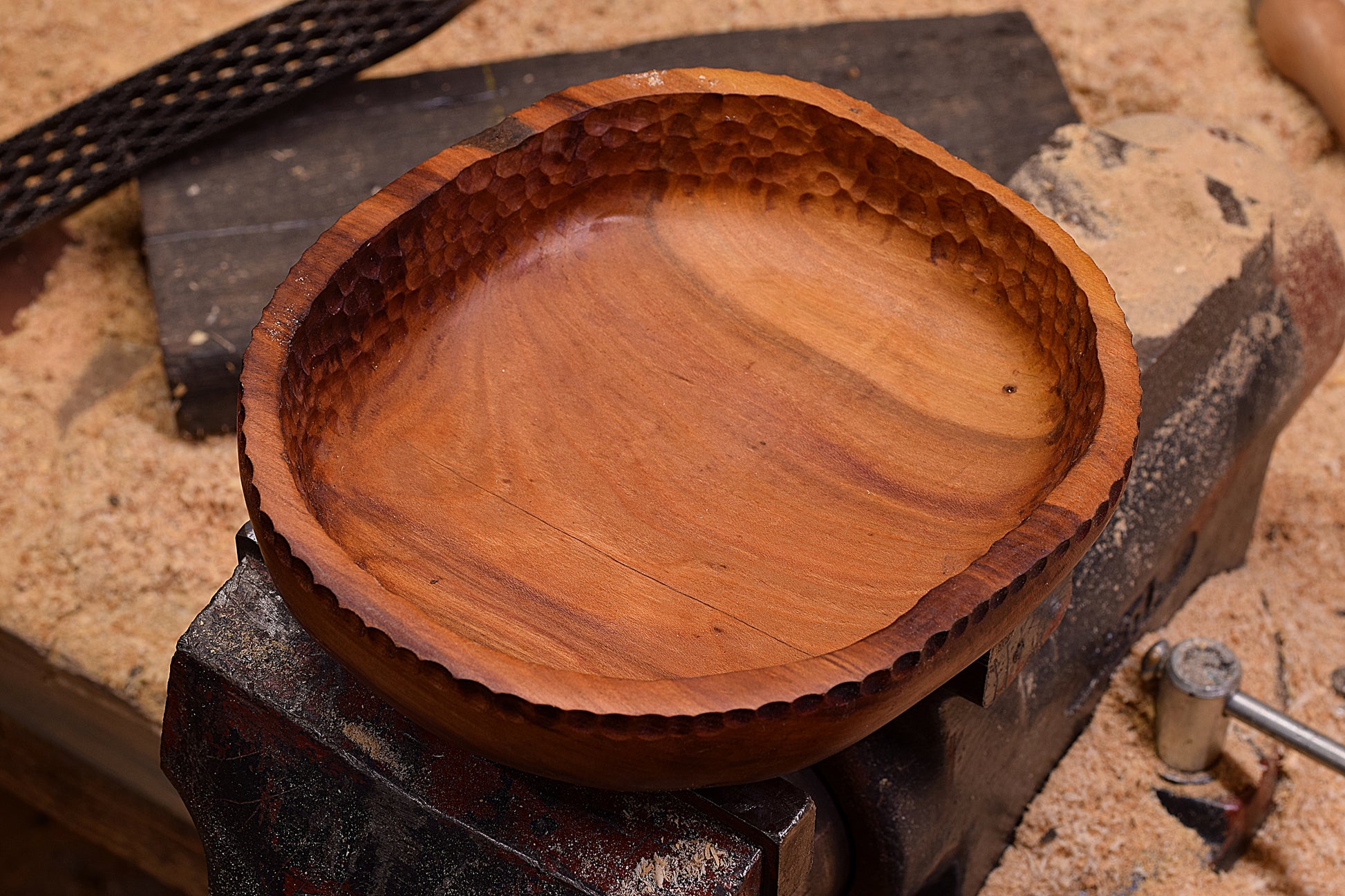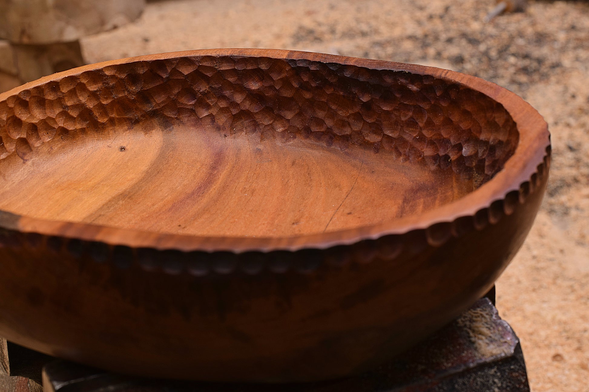 Ručno izrađena drvena posuda izrađena je od šljive. Sadrži različite teksture i glatke površine.