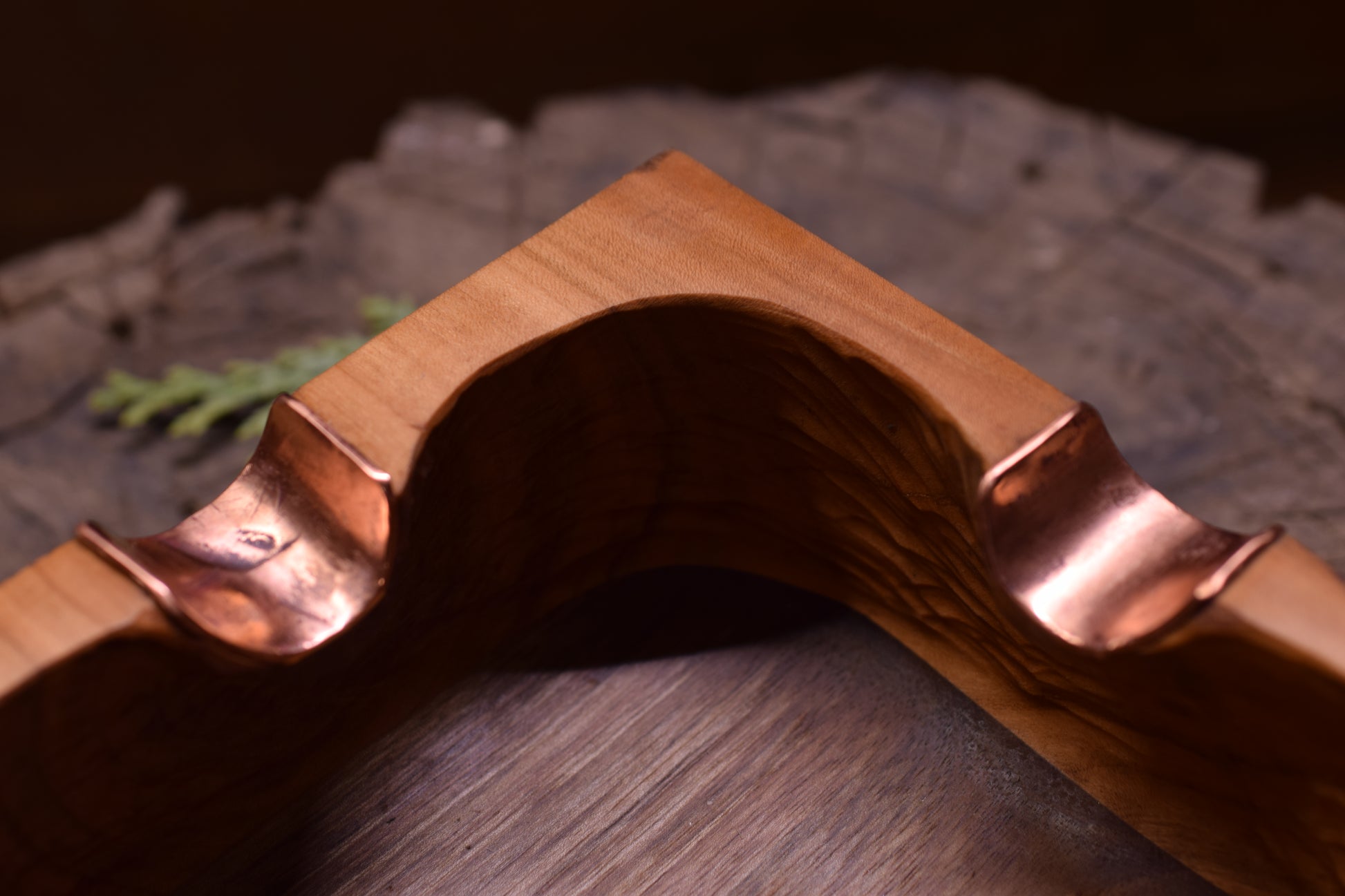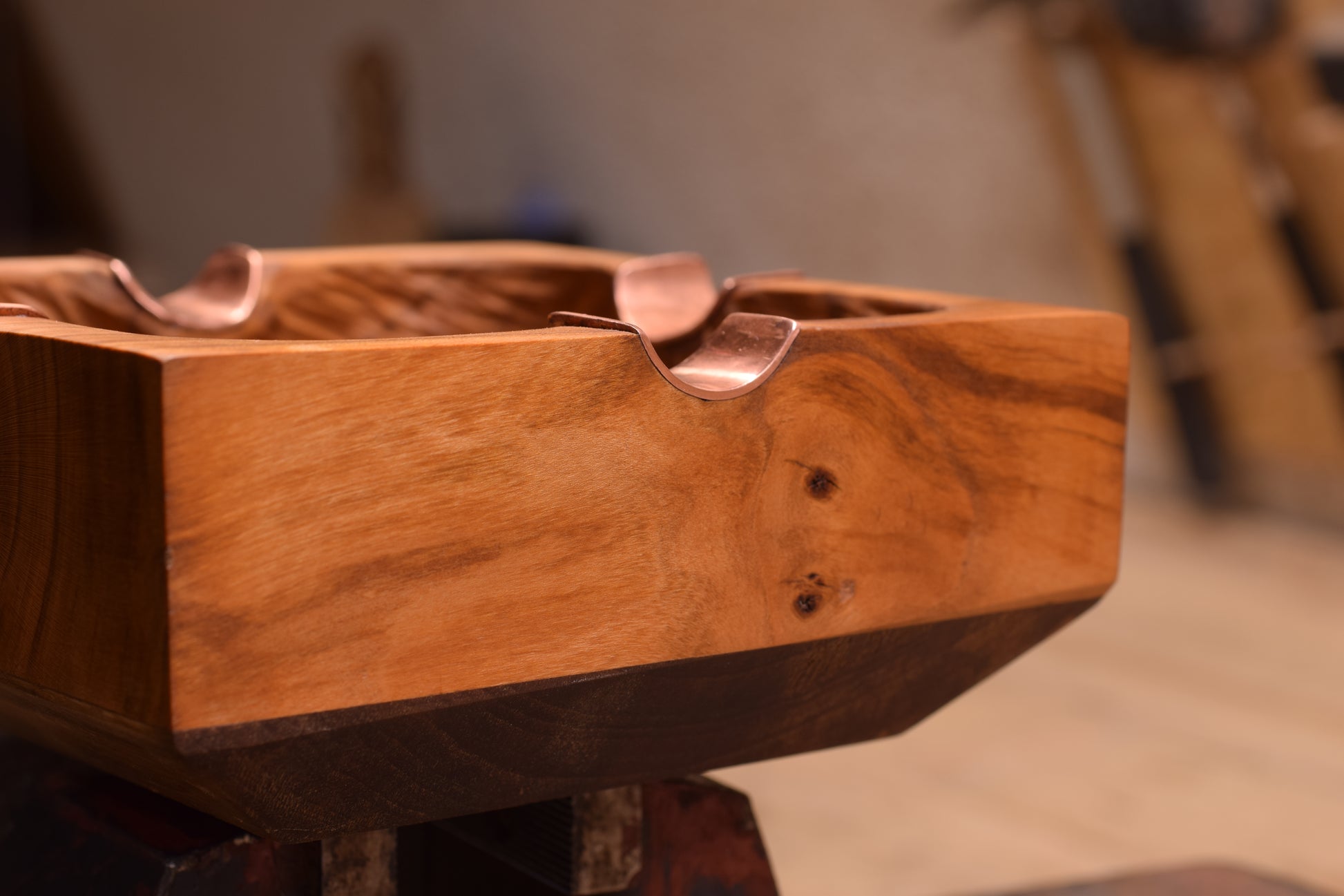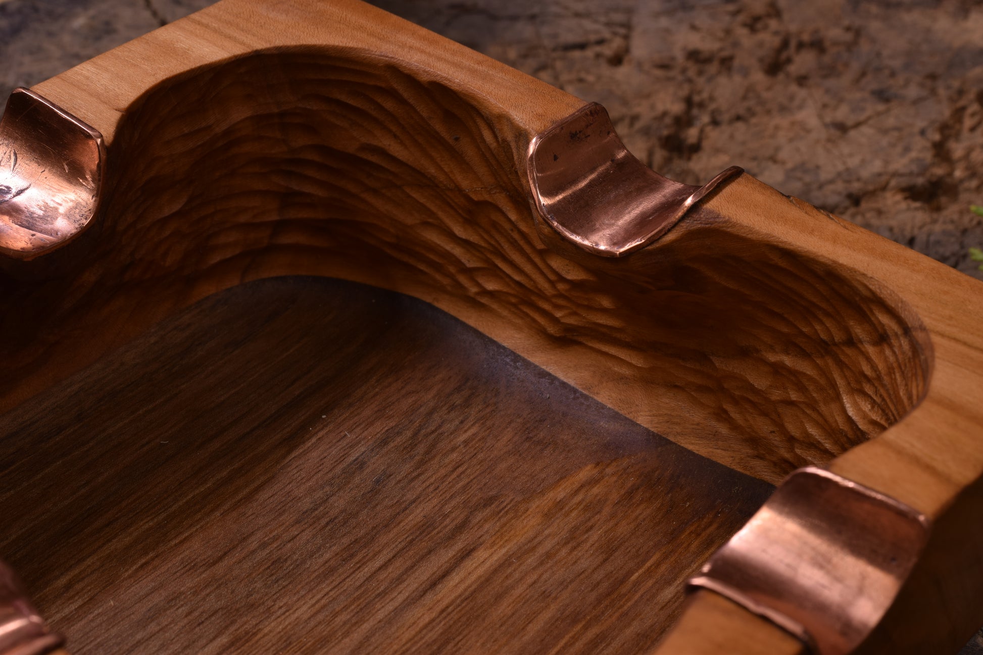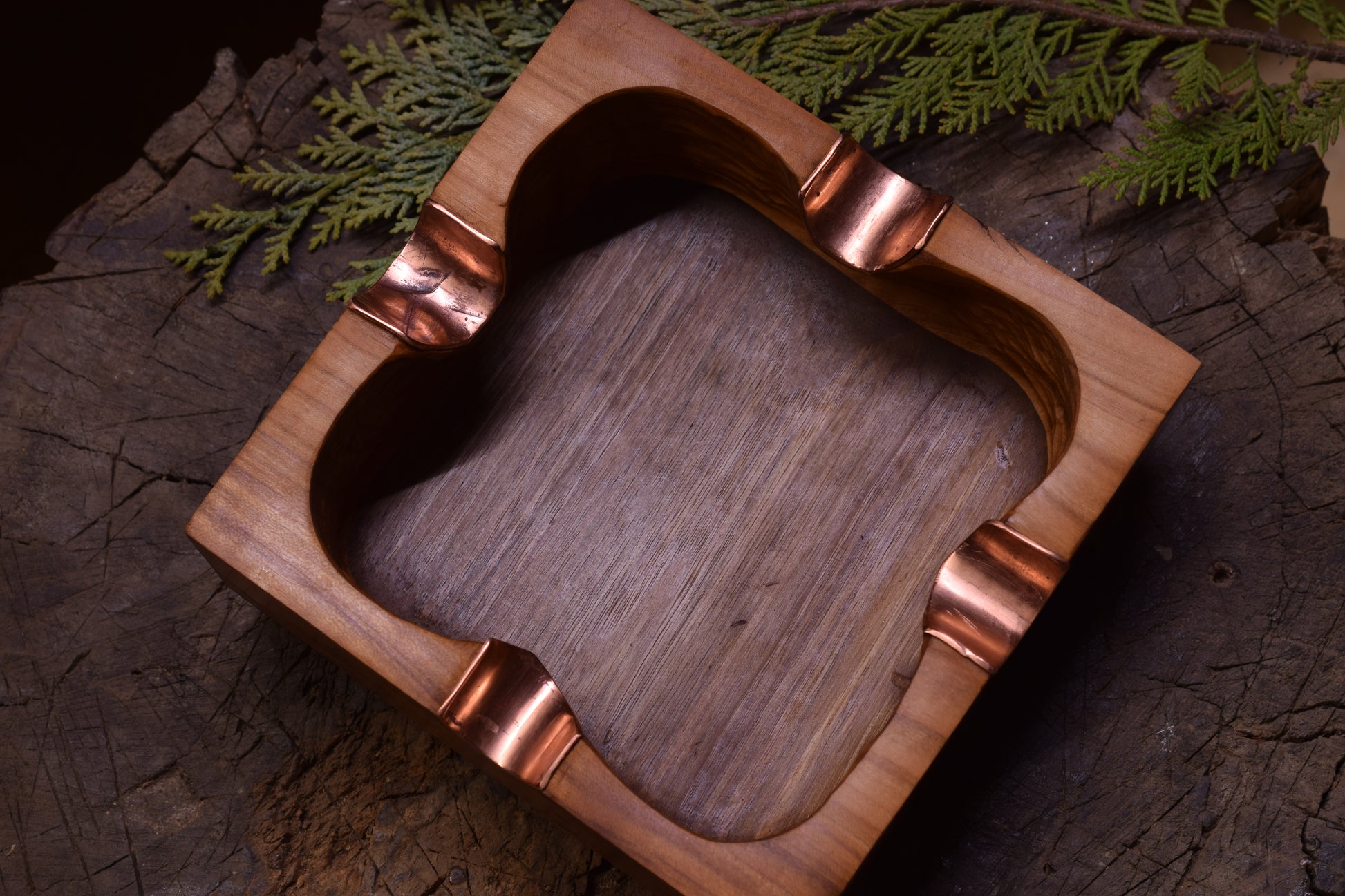 Ova ručno izrađena drvena pepeljara izrađena od raznog drveta ističe prirodni karakter materijala, ukrašena raznim teksturama te bakrenim urezima za odlaganje cigarete.