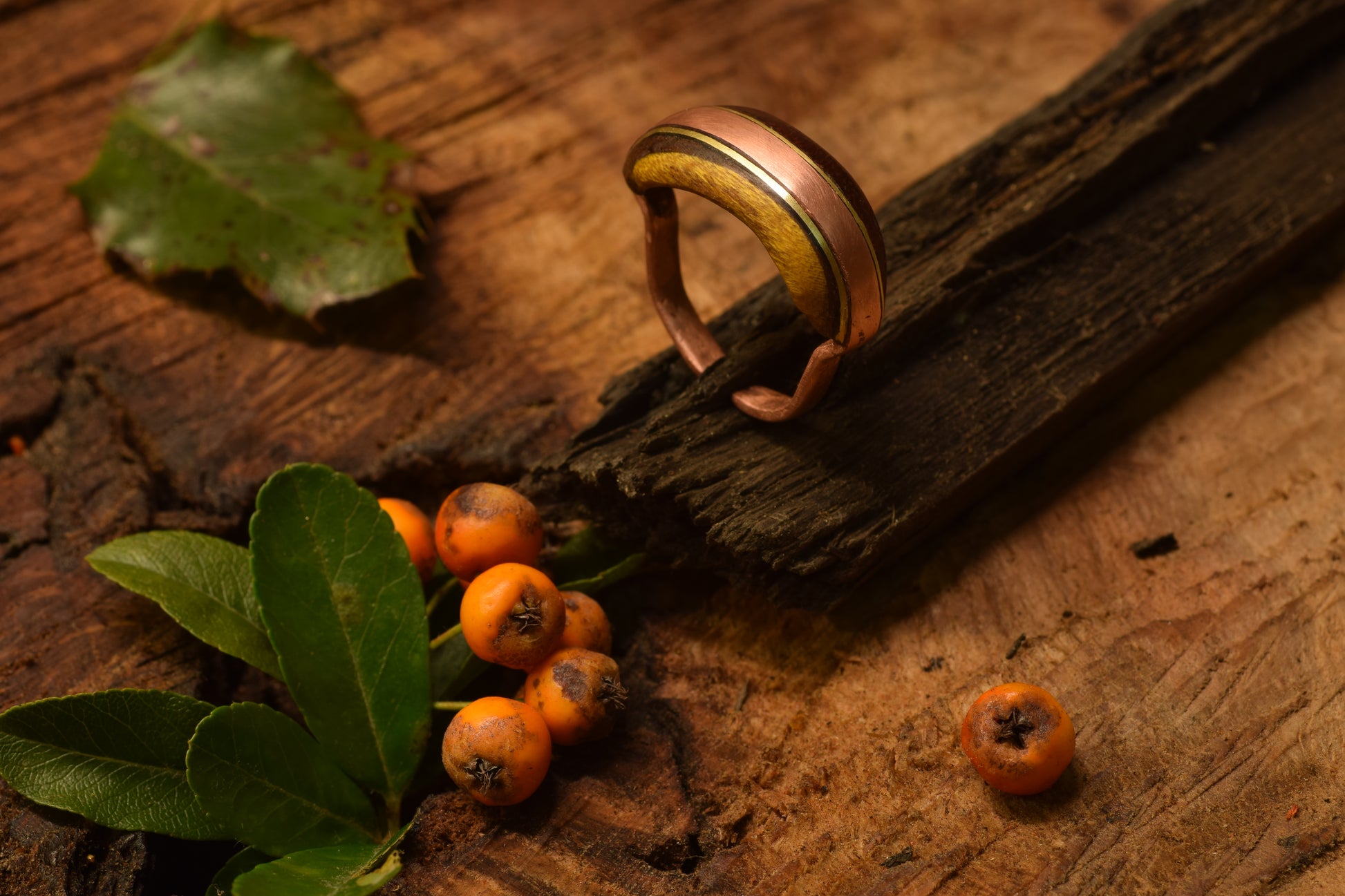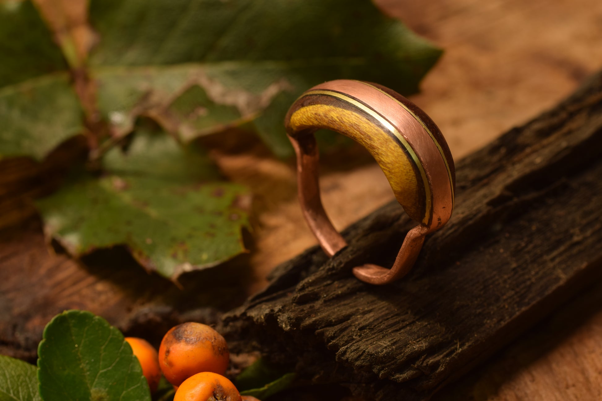 Bakreni prsten s mesingom i komadićima paduka i duda.