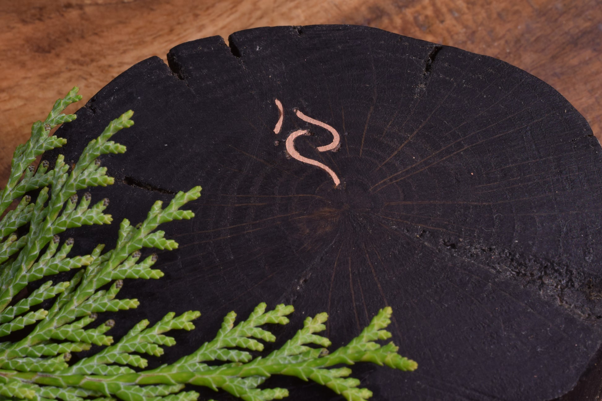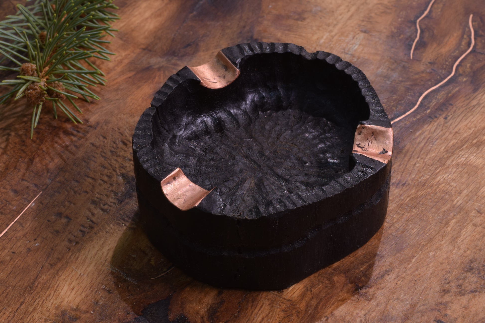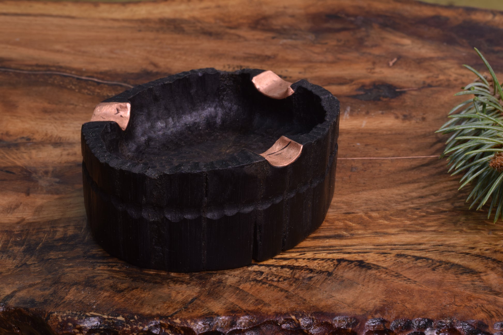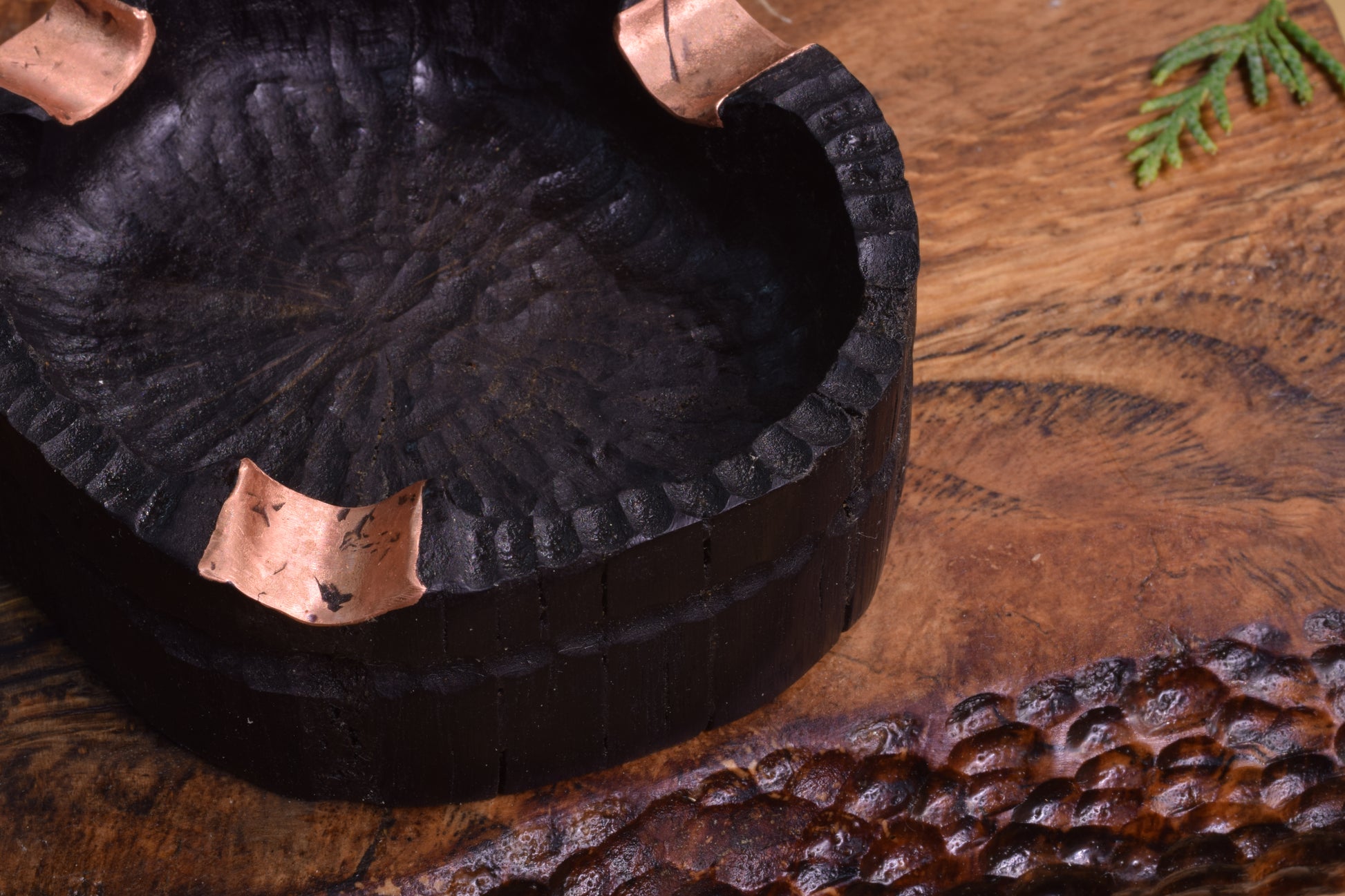 Ova ručno izrađena drvena pepeljara izrađena od močvarnog hrasta - abonosa ističe prirodni karakter i boju materijala, ukrašena raznim teksturama te bakrenim detaljima i urezima za odlaganje cigarete. Abonos je idealno drvo za izradu pepeljara, zbog svoje tvrdoće i otpornosti na visoke temperature.