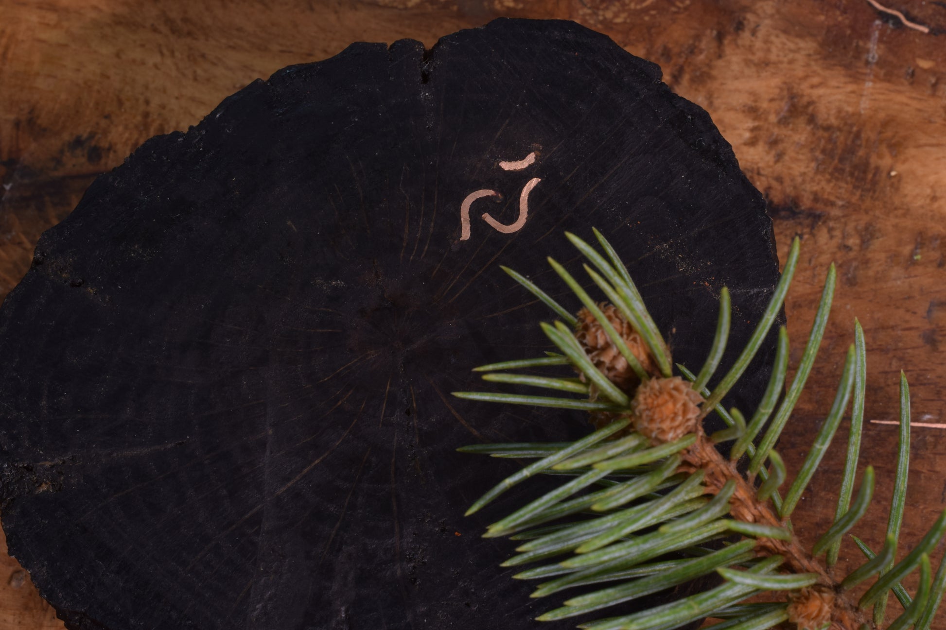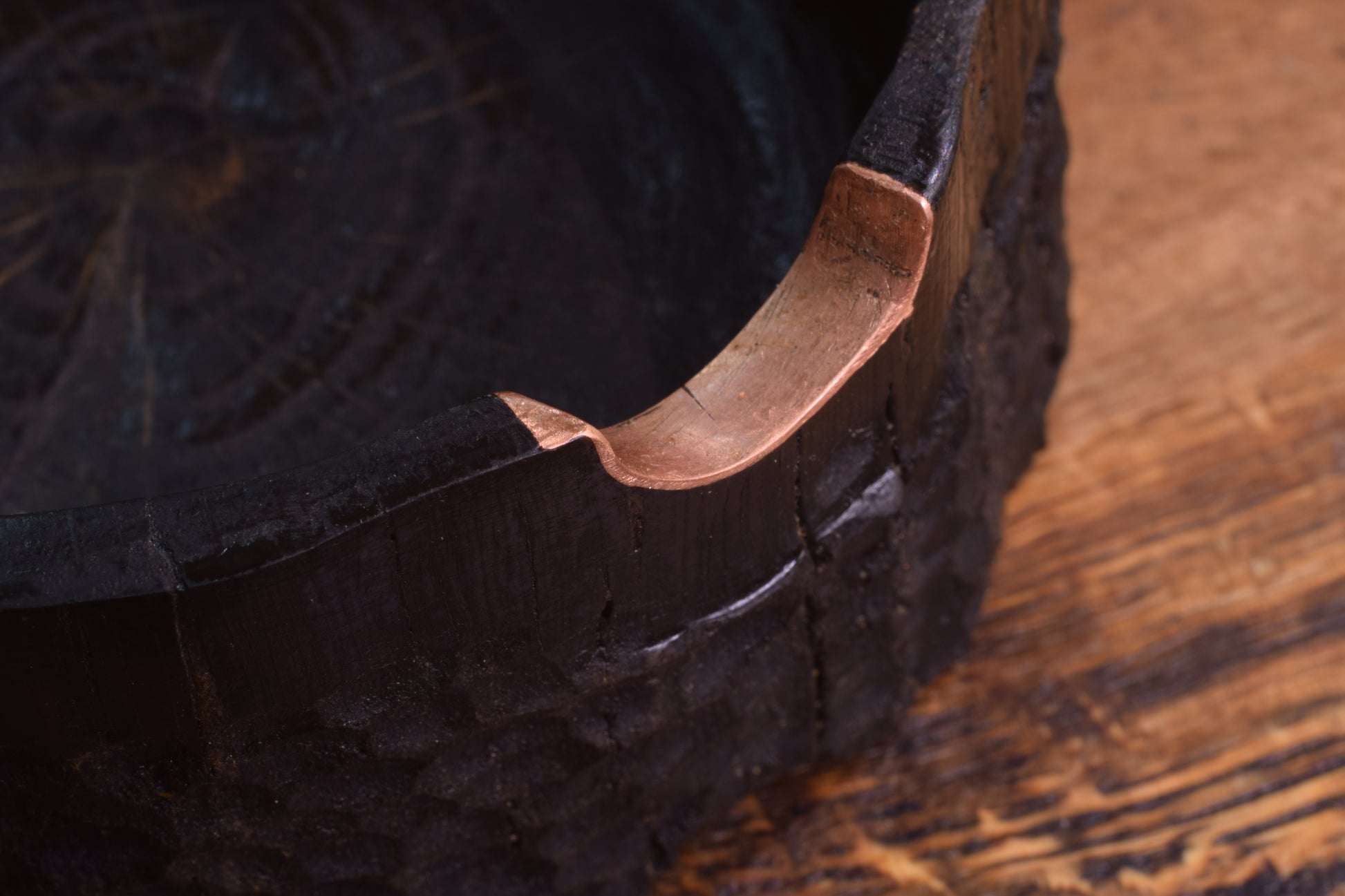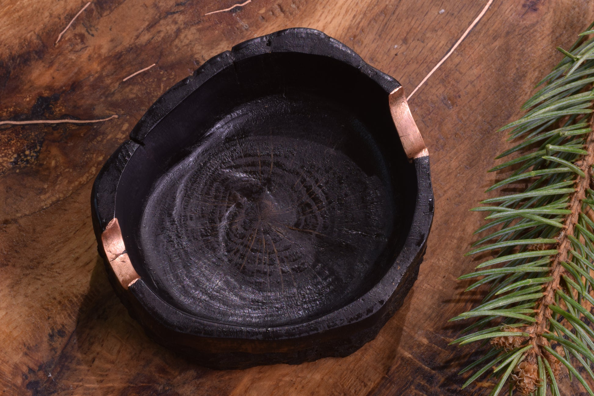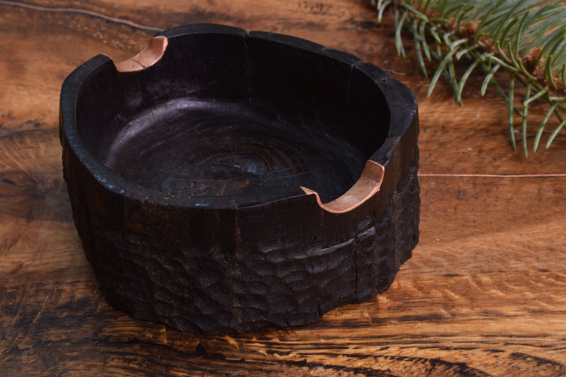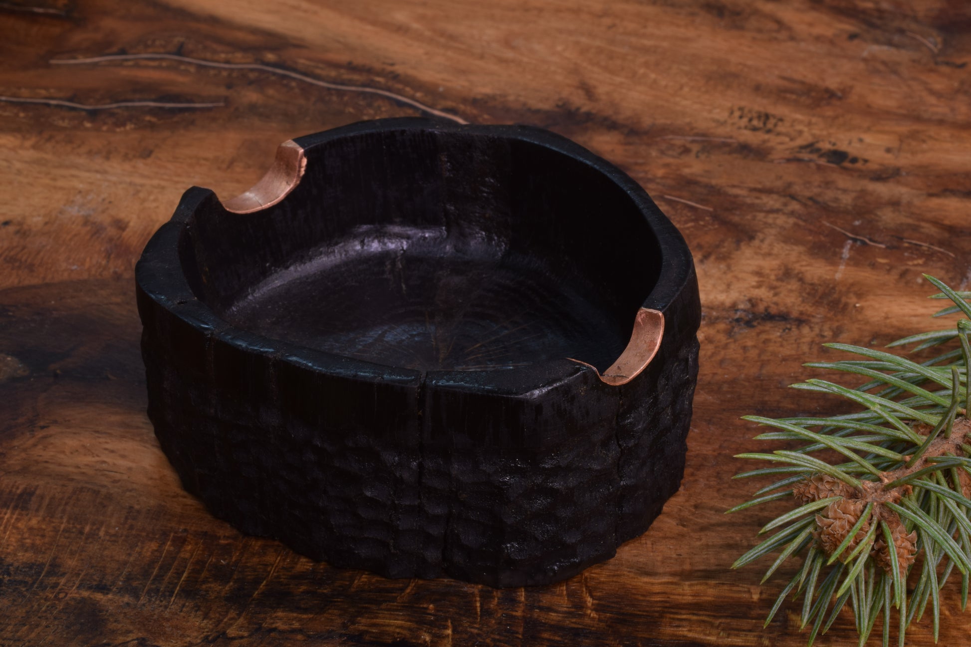 Ova ručno izrađena drvena pepeljara izrađena od  močvarnog hrasta - abonosa ističe prirodni karakter i boju materijala, ukrašena raznim teksturama  te bakrenim detaljima i urezima za odlaganje cigarete. Abonos je idealno drvo za izradu pepeljara, zbog svoje tvrdoće i otpornosti na visoke temperature.