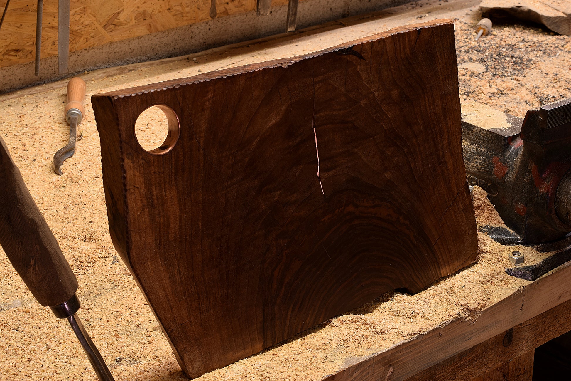 Ručno izrađena daska za rezanje od oraha, skulpturalno oblikovana od jednog komada drva.