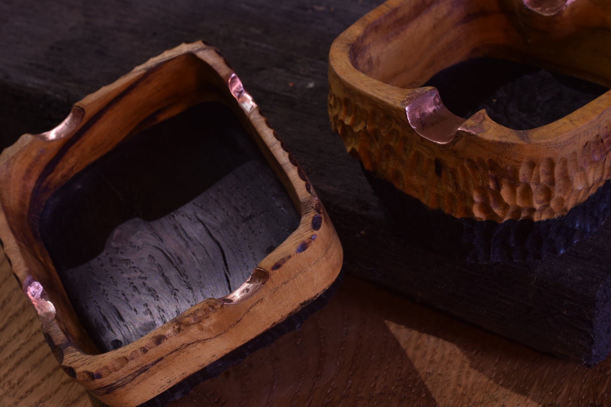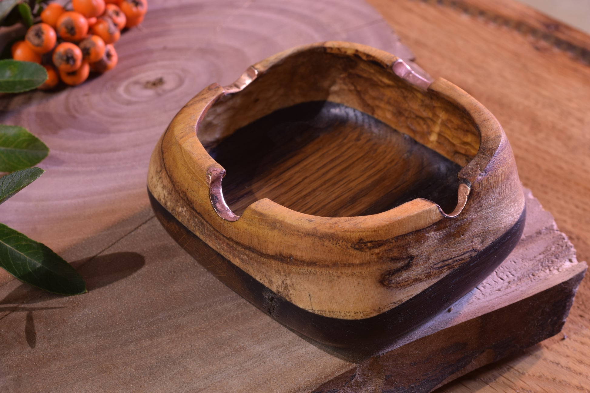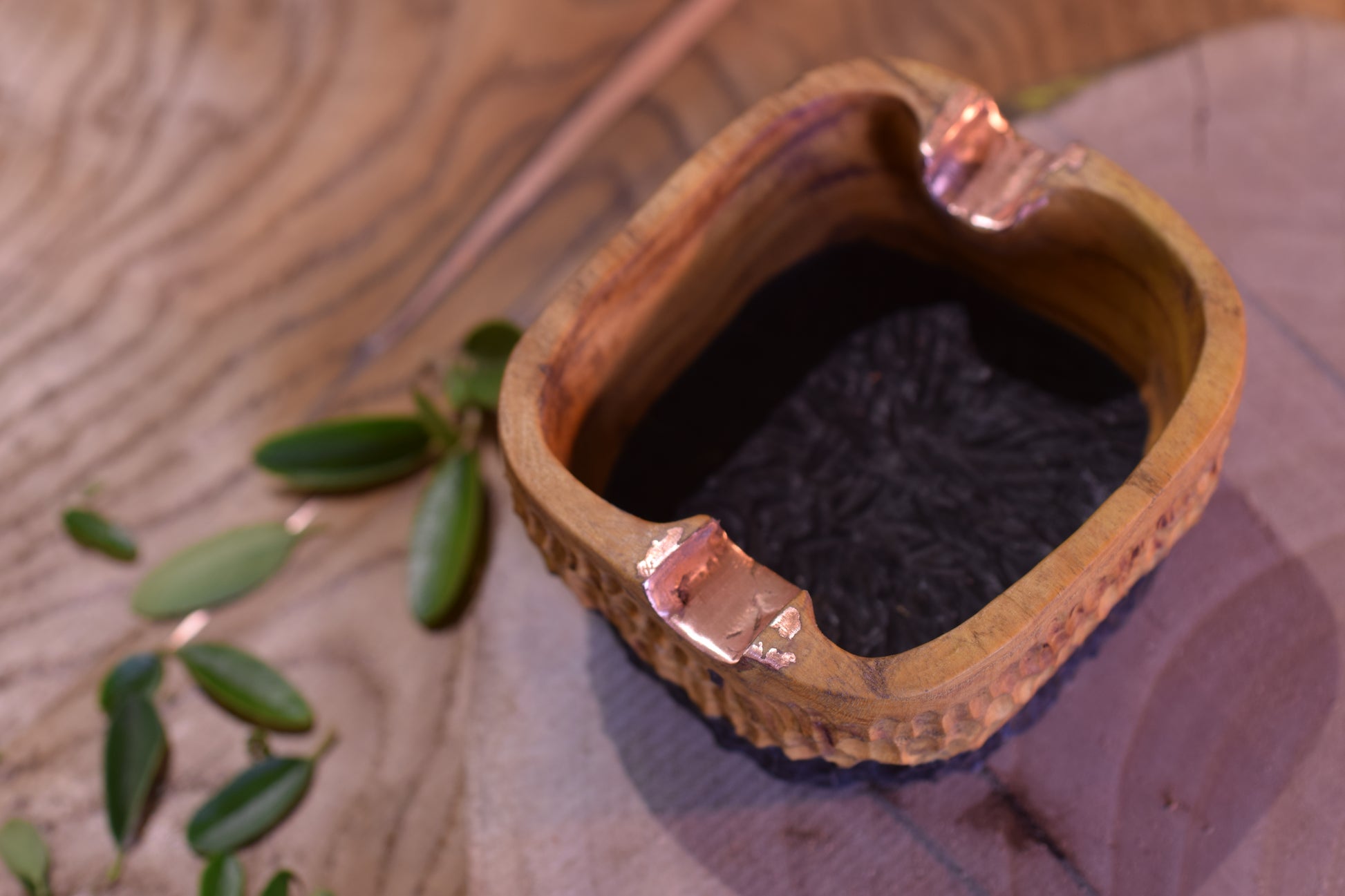 Ova ručno izrađena drvena pepeljara izrađena od močvarnog hrasta - abonosa i hrasta ističe prirodni karakter i boju materijala, ukrašena raznim teksturama te bakrenim detaljima i urezima za odlaganje cigarete. Abonos je idealno drvo za izradu pepeljara, zbog svoje tvrdoće i otpornosti na visoke temperature.