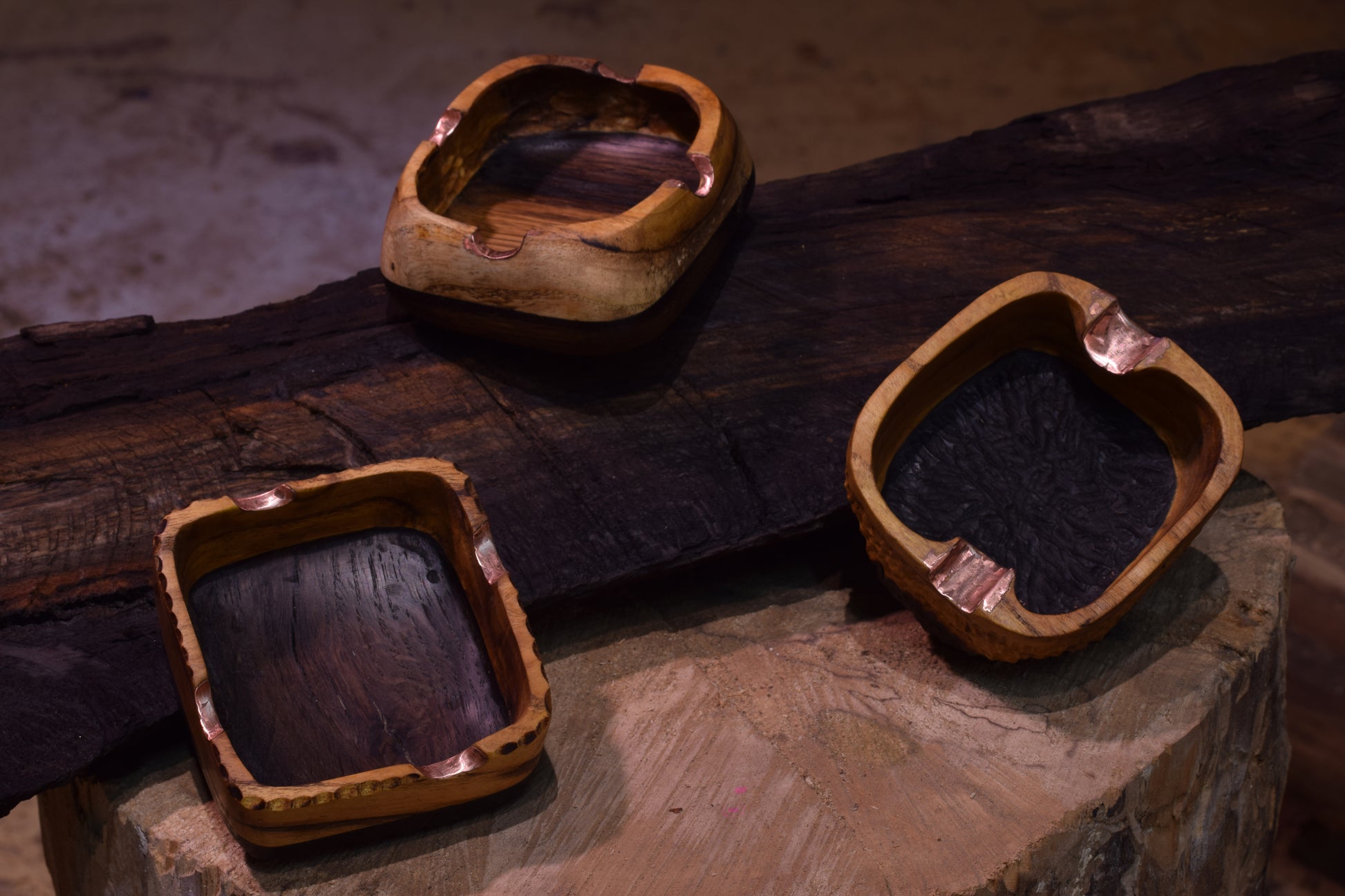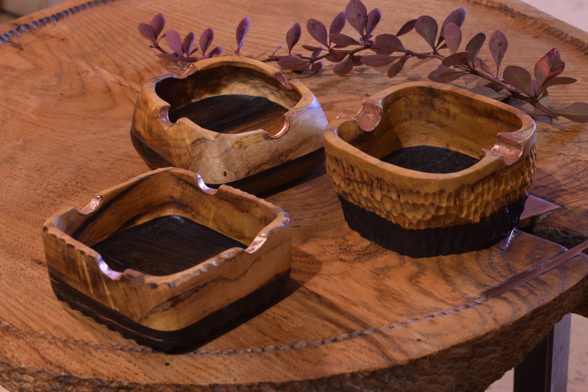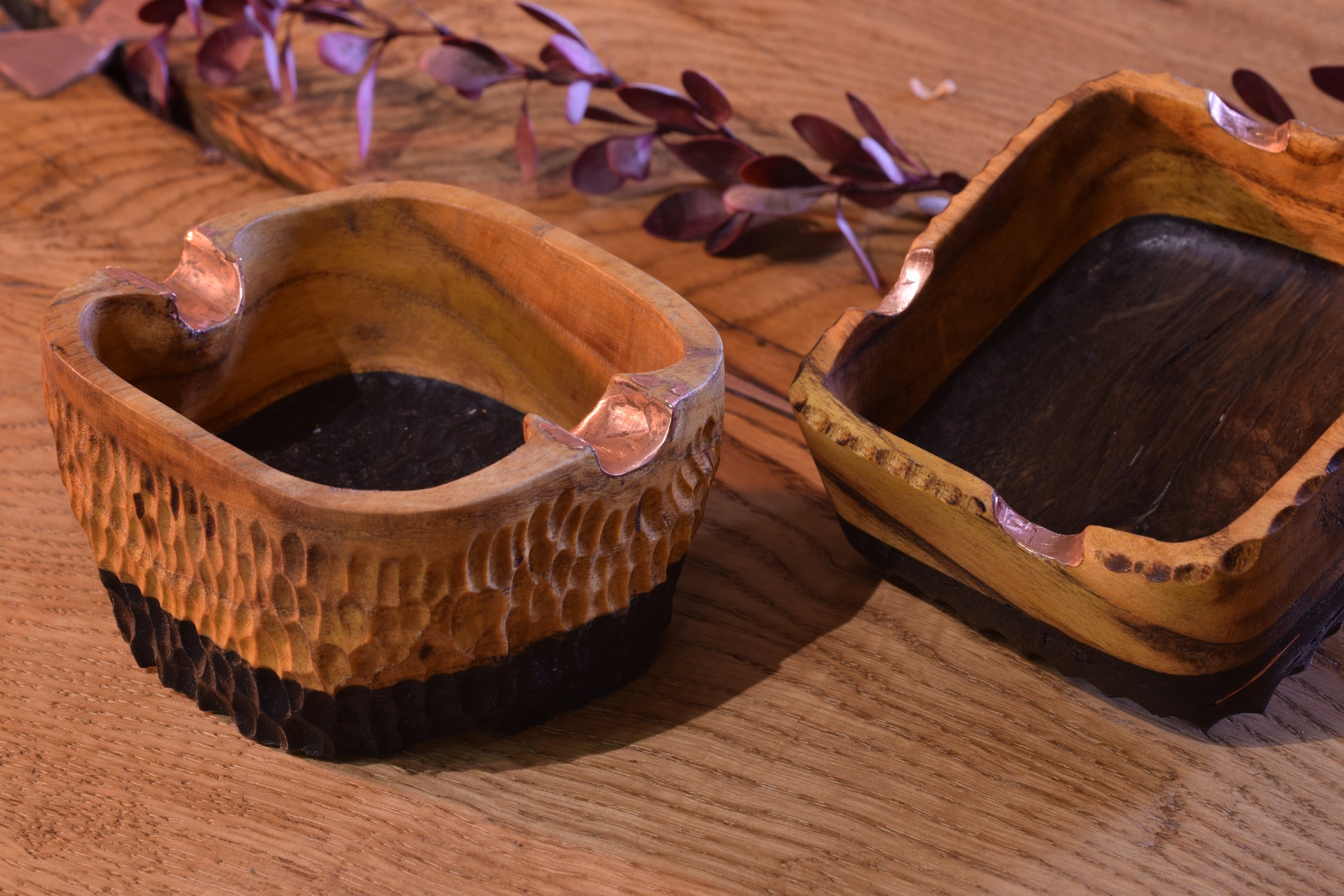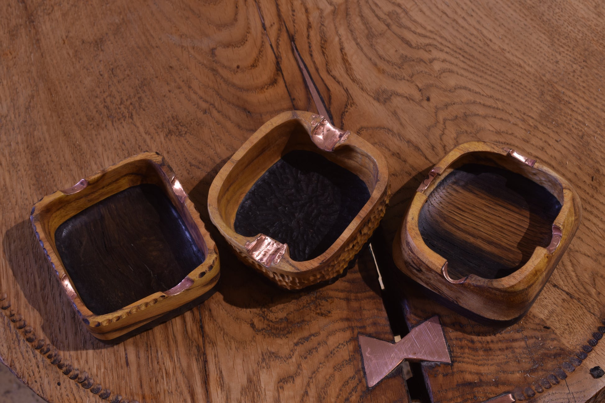 Ova ručno izrađena drvena pepeljara izrađena od močvarnog hrasta - abonosa i hrasta ističe prirodni karakter i boju materijala, ukrašena raznim teksturama te bakrenim detaljima i urezima za odlaganje cigarete. Abonos je idealno drvo za izradu pepeljara, zbog svoje tvrdoće i otpornosti na visoke temperature.