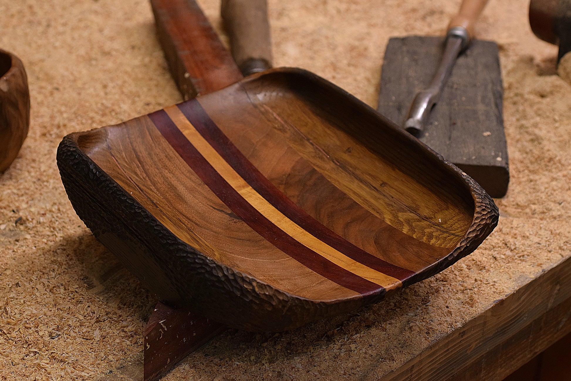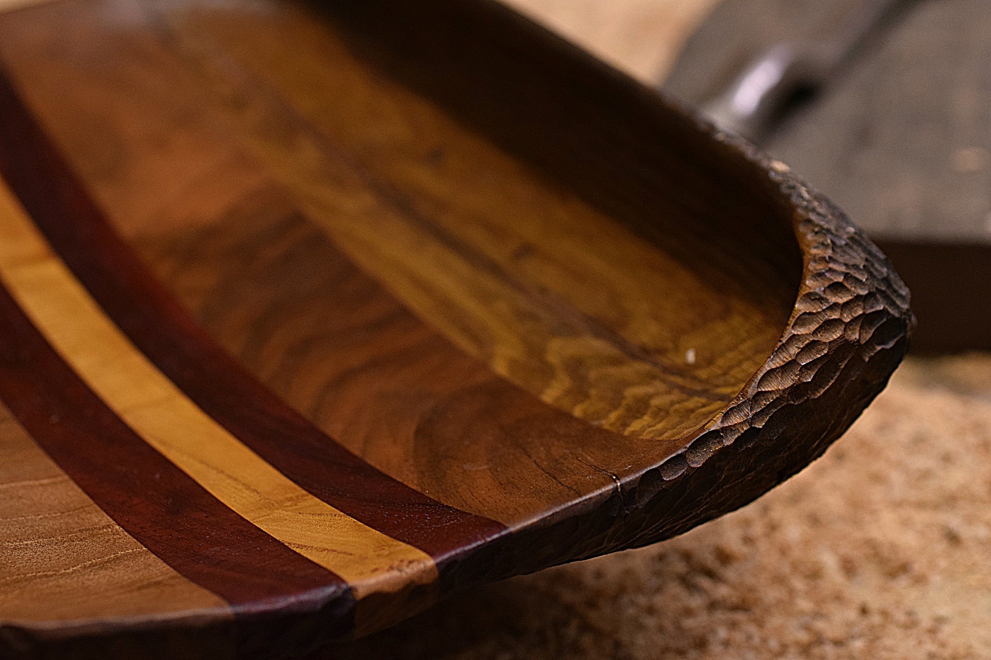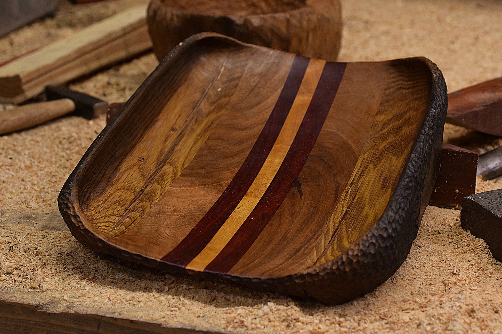 Ručno izrađena drvena zdjela izrađena kombinacijom raznog drveta. Naglašena je dinamična tekstura na rubovima posude te glatka unutrašnjost. Posebnost joj daje način izrade iz više komada drveta, čija priroda boja i raznolikost tonova daju unikatan izgled.