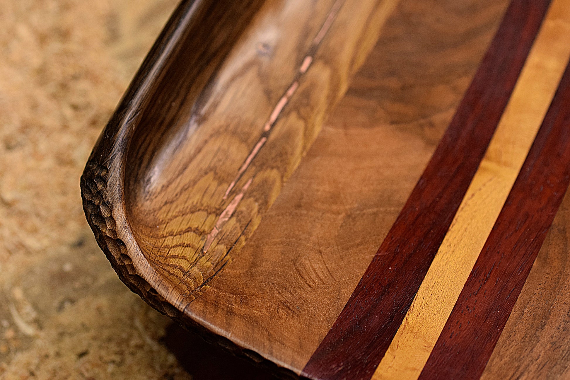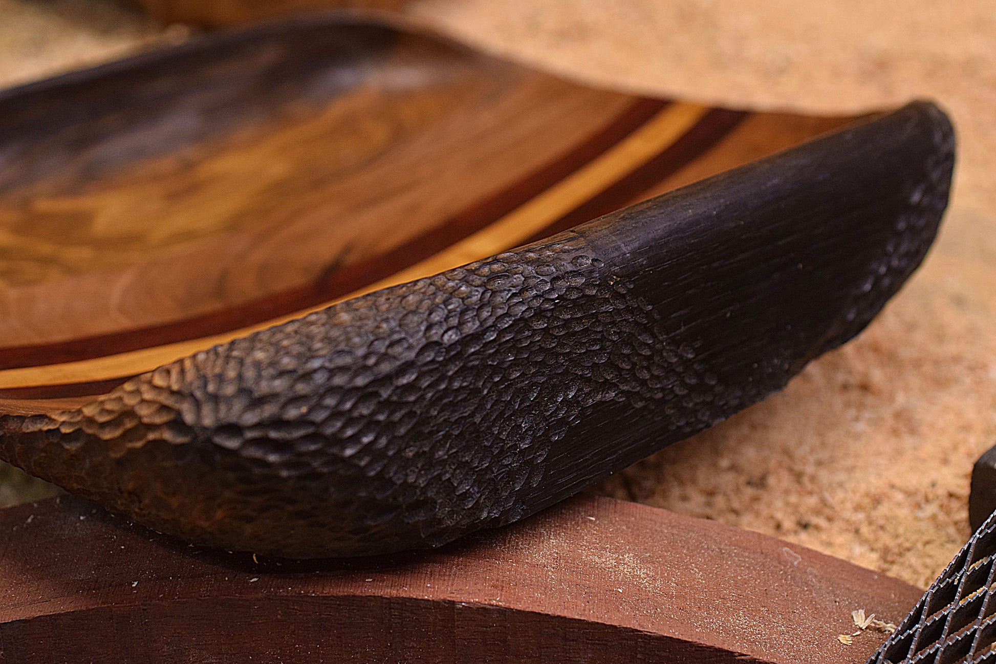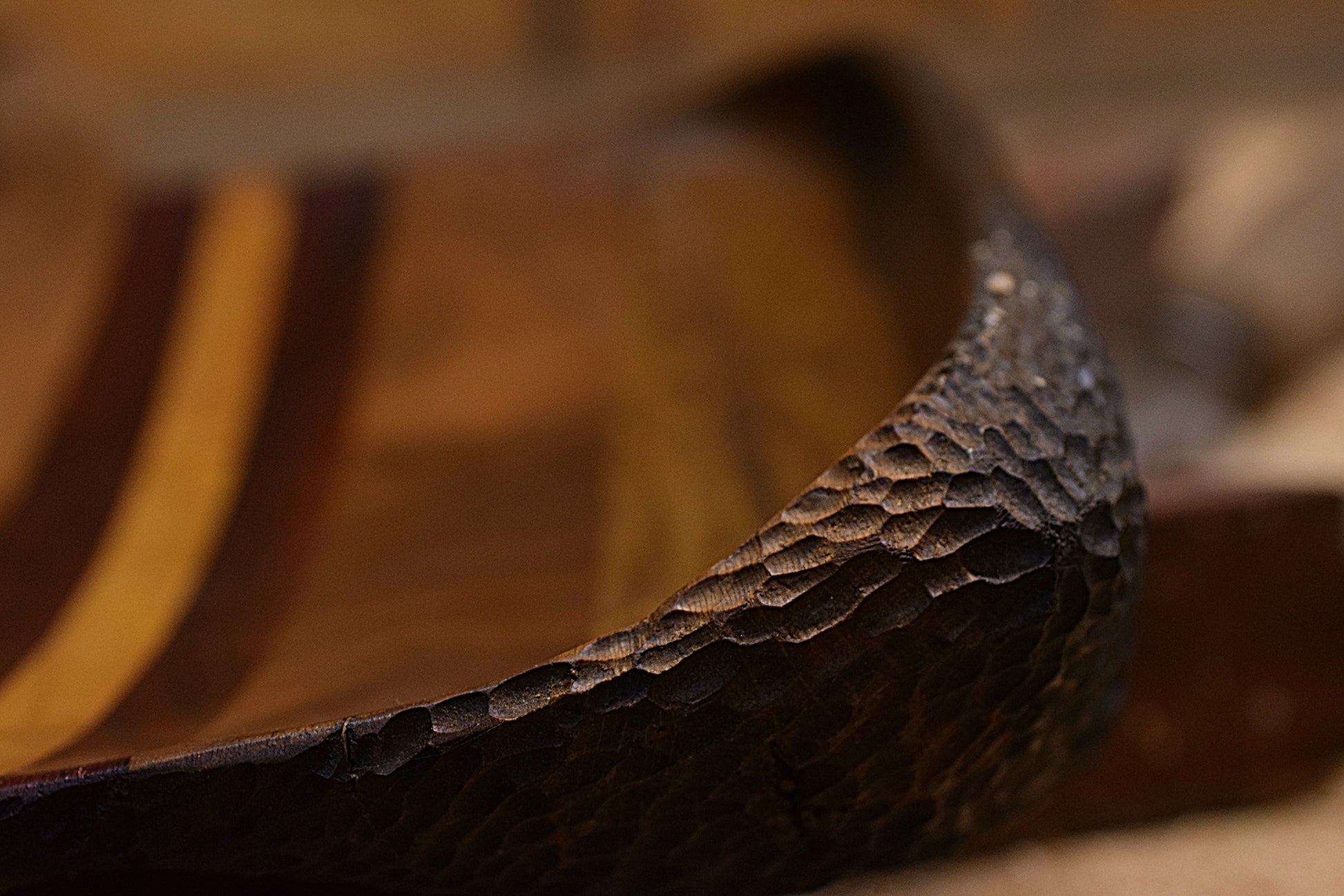 Ručno izrađena drvena zdjela izrađena kombinacijom raznog drveta. Naglašena je dinamična tekstura na rubovima posude te glatka unutrašnjost. Posebnost joj daje način izrade iz više komada drveta, čija priroda boja i raznolikost tonova daju unikatan izgled.