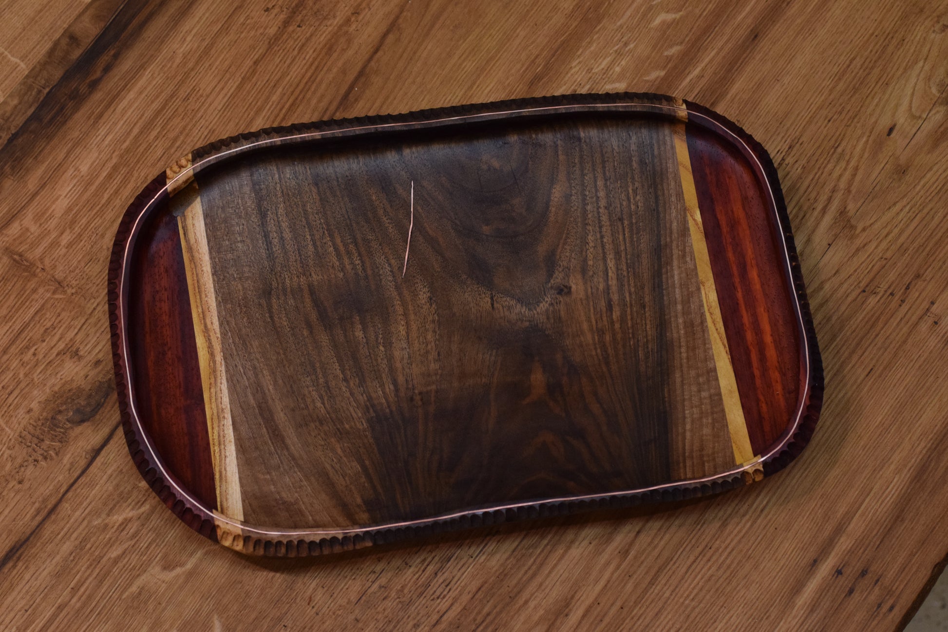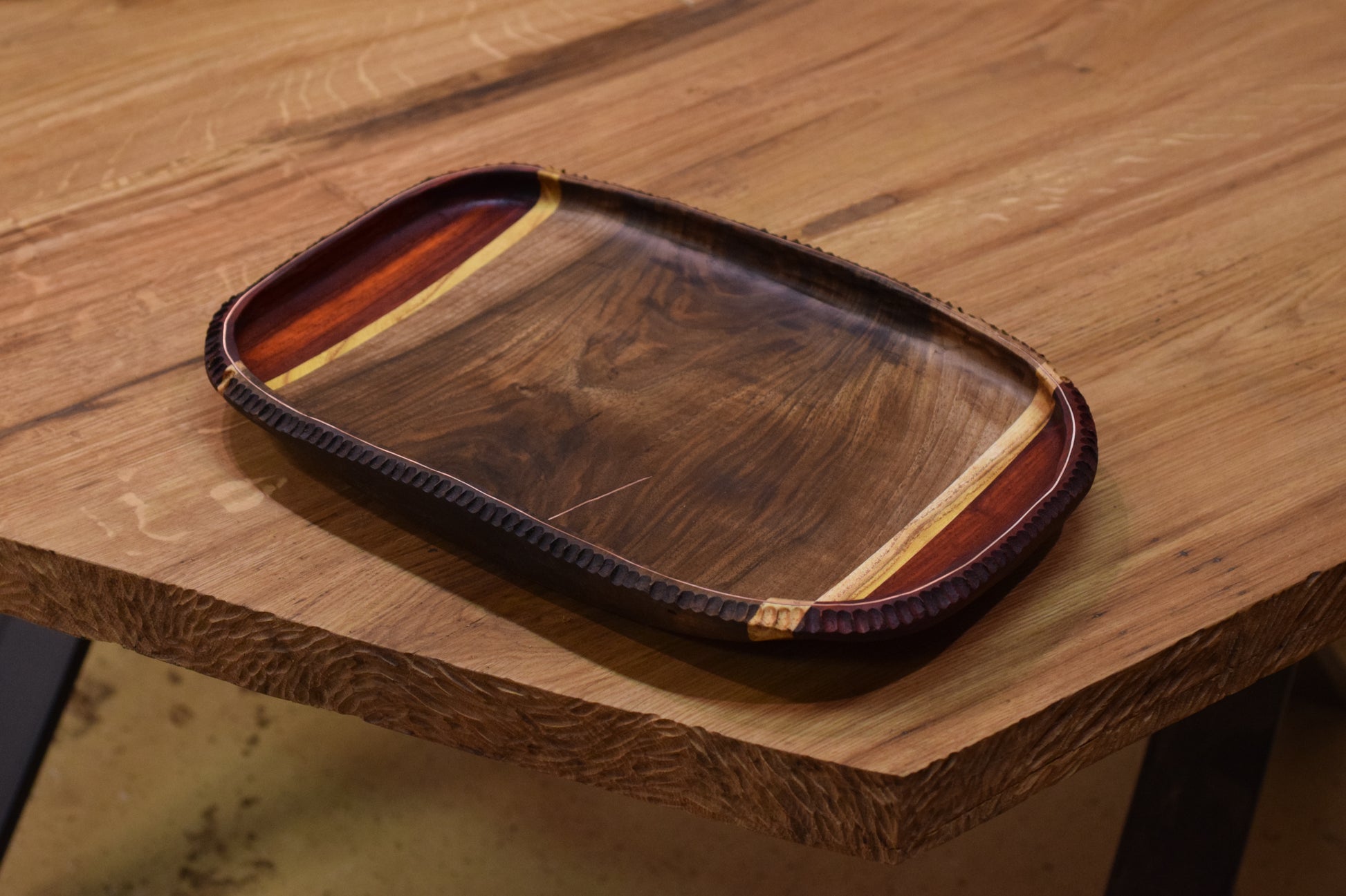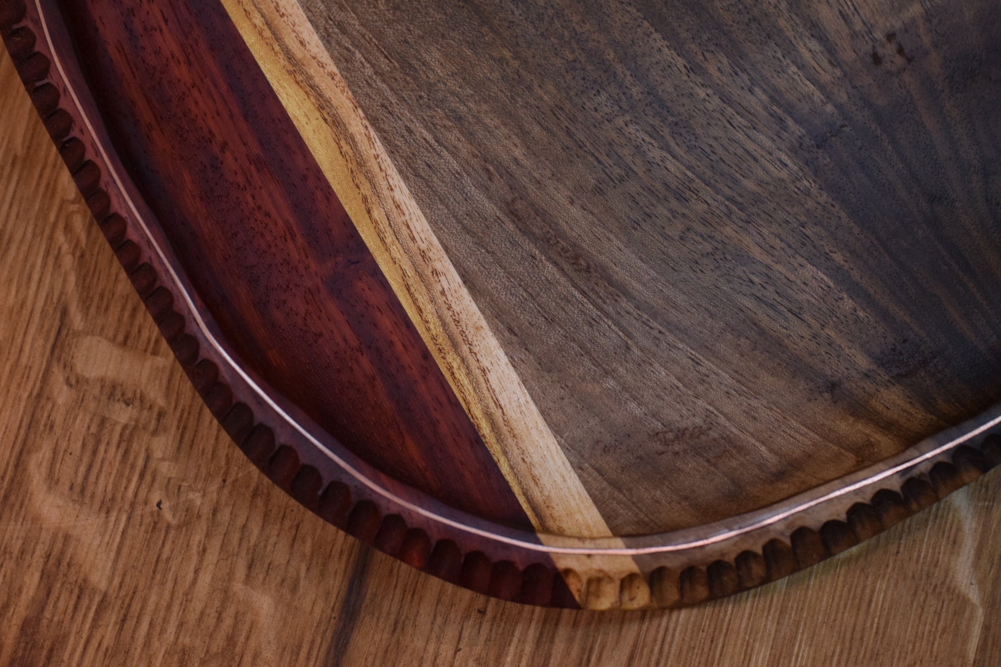 Ručno izrađena drvena posuda izrađena kombinacijom raznog drveta. Poseban izgled daje joj daje način izrade iz više komada drveta, čija priroda boja i raznolikost tonova, uz različite teksture i karakteri povrđine i bakreni detalje daju joj unikatan izgled