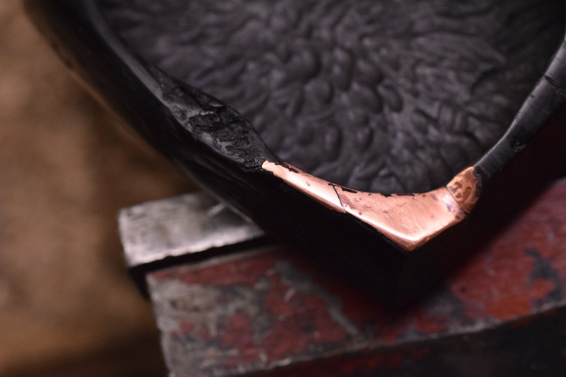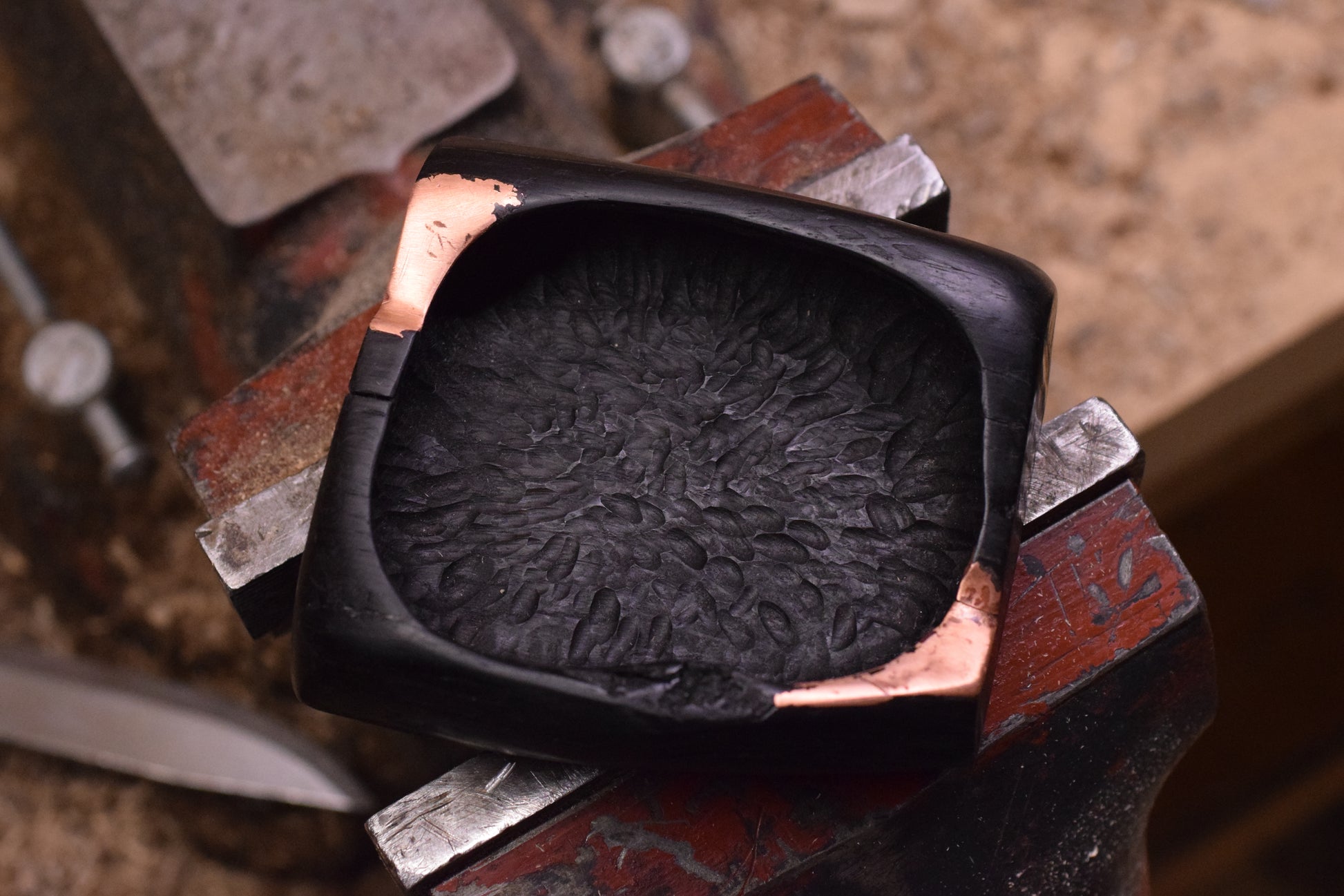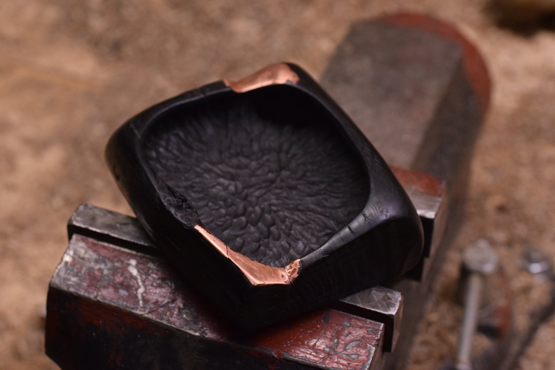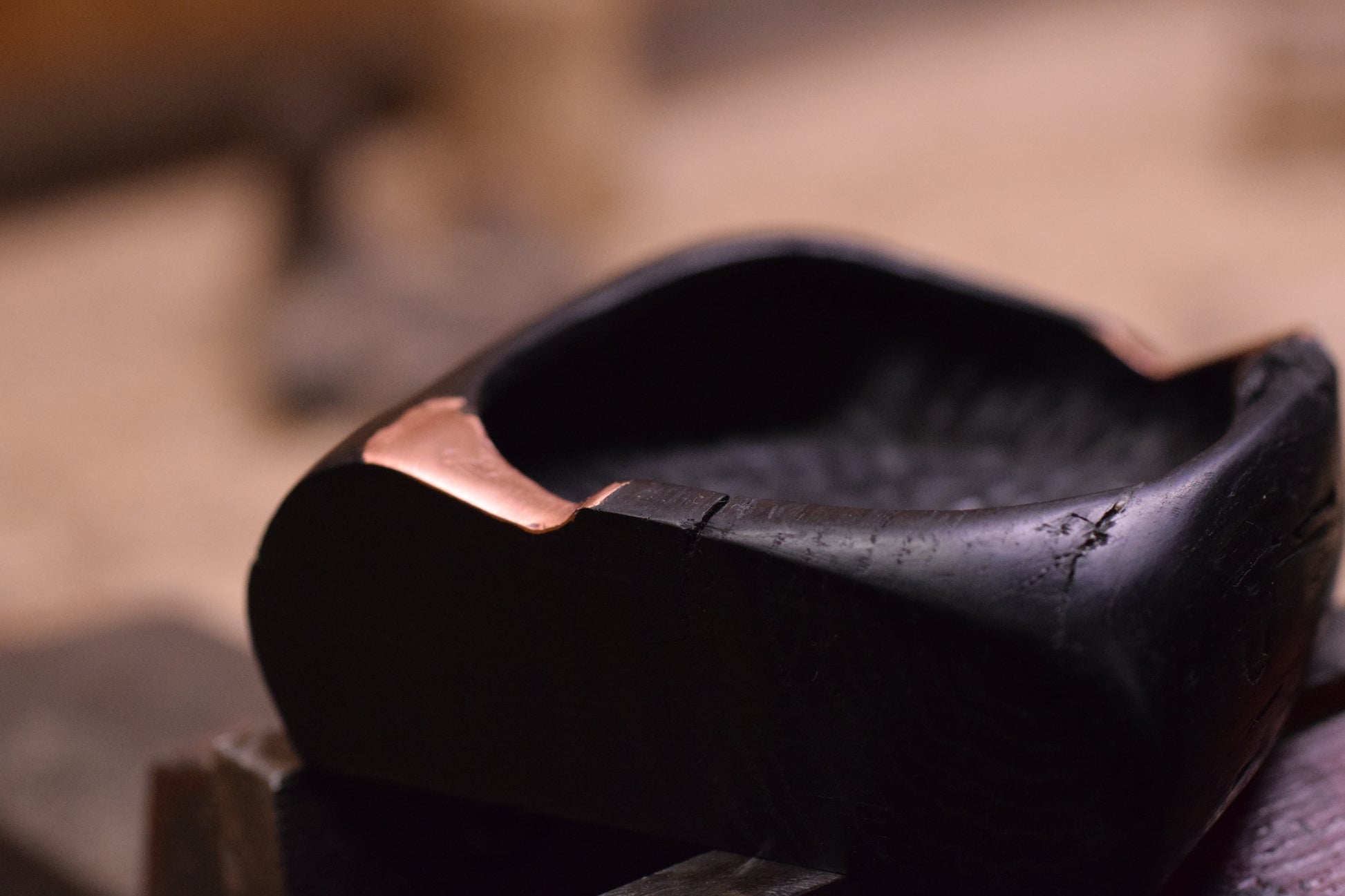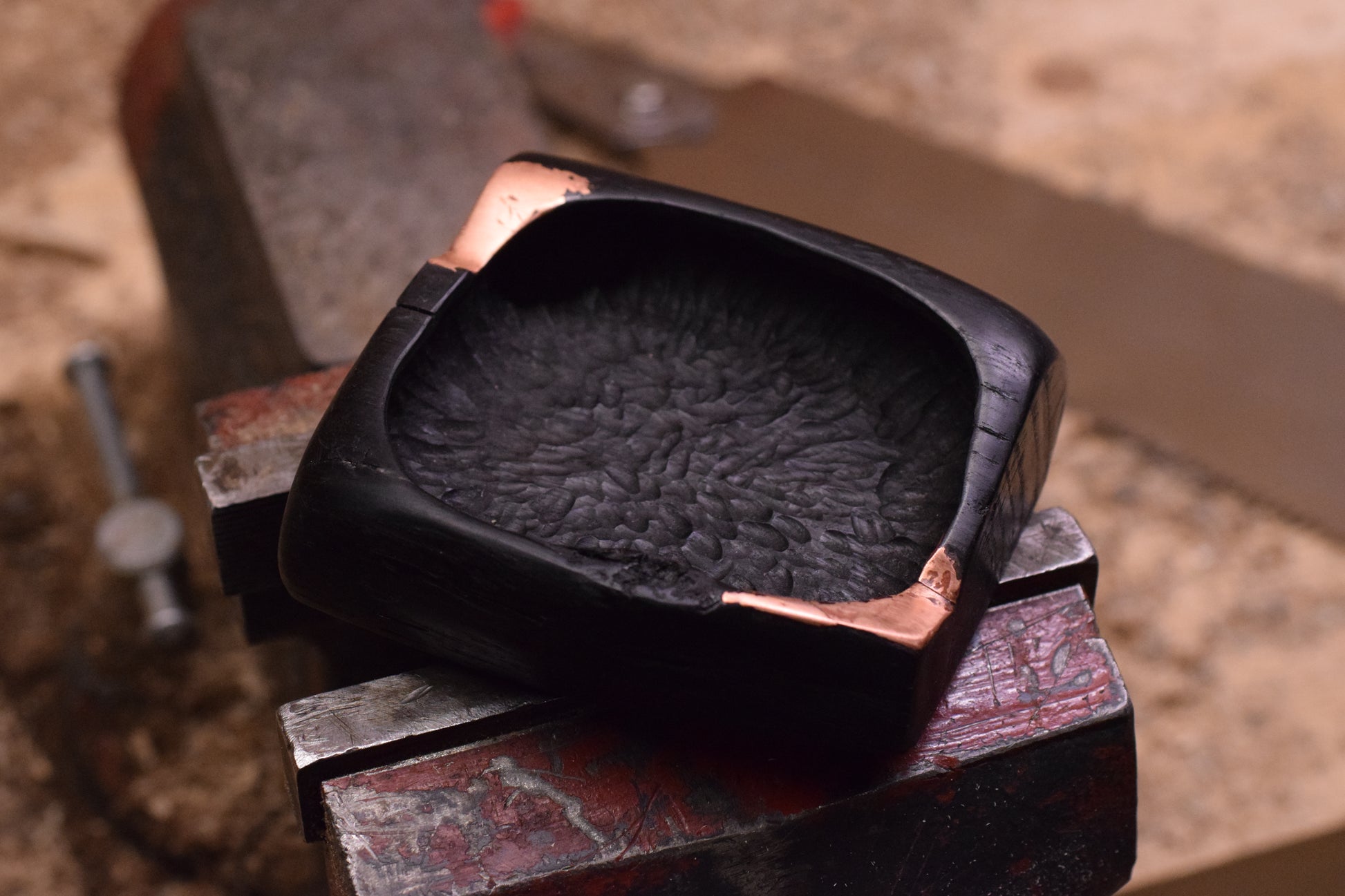 Ova ručno izrađena drvena pepeljara izrađena od močvarnog hrasta - abonosa ističe prirodni karakter i boju materijala, ukrašena raznim teksturama te bakrenim detaljima i urezima za odlaganje cigarete. Abonos je idealno drvo za izradu pepeljara, zbog svoje tvrdoće i otpornosti na visoke temperature.