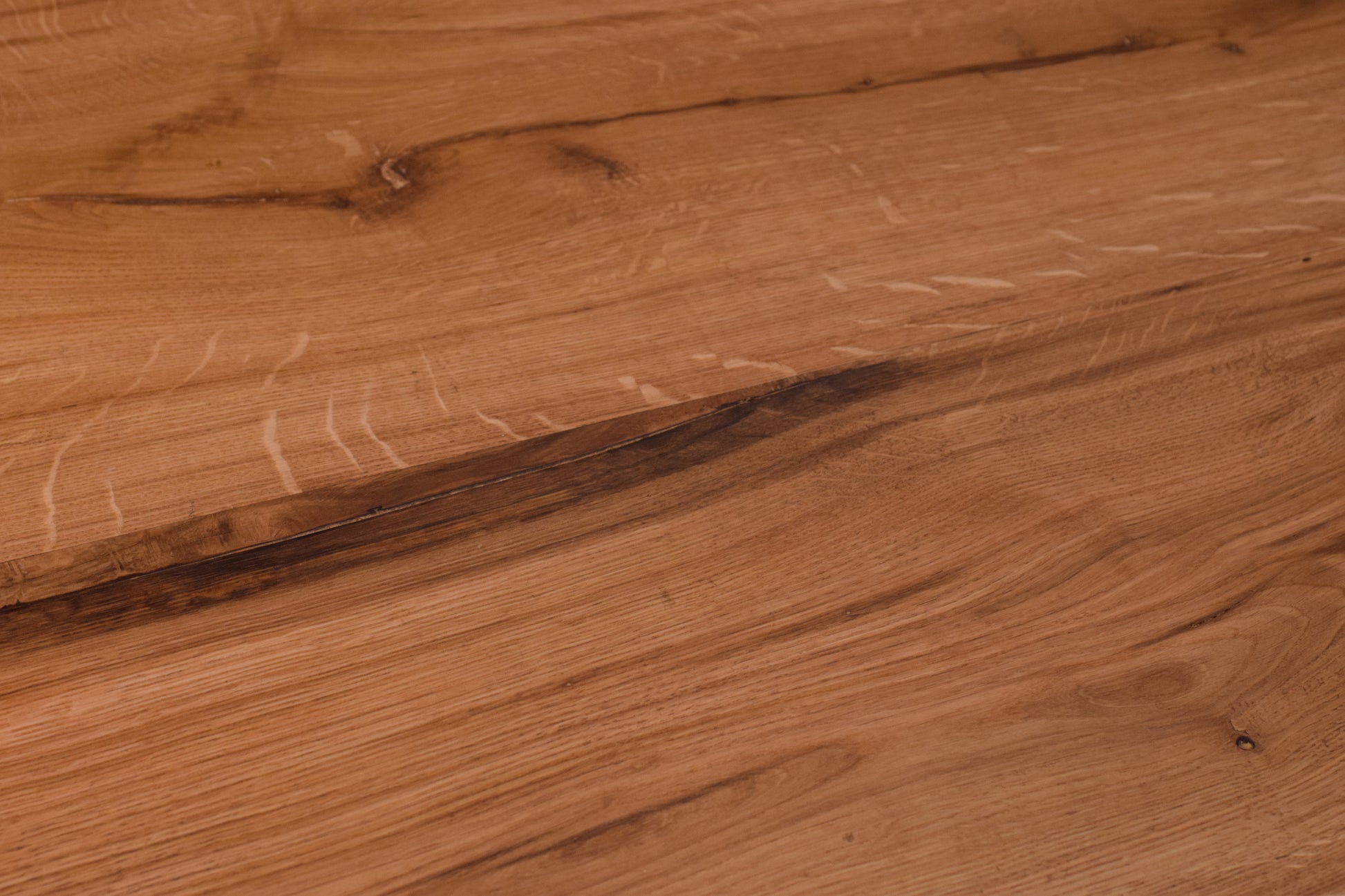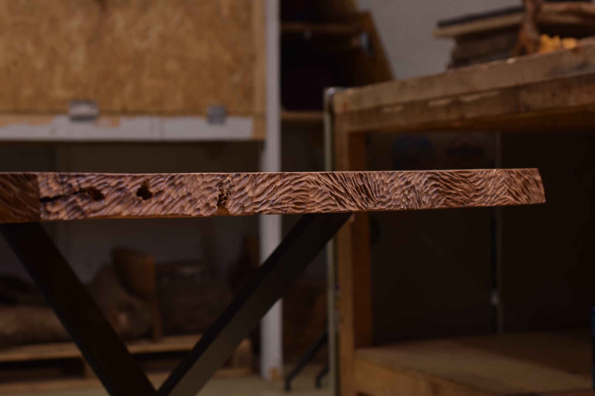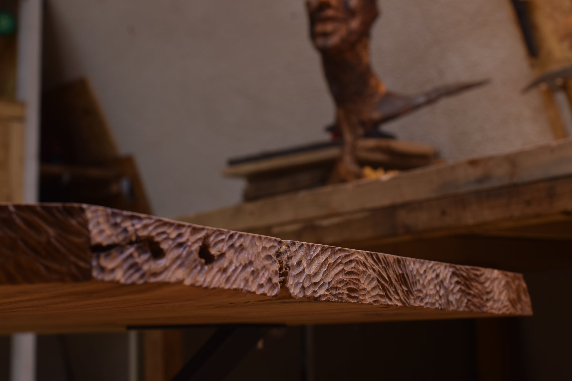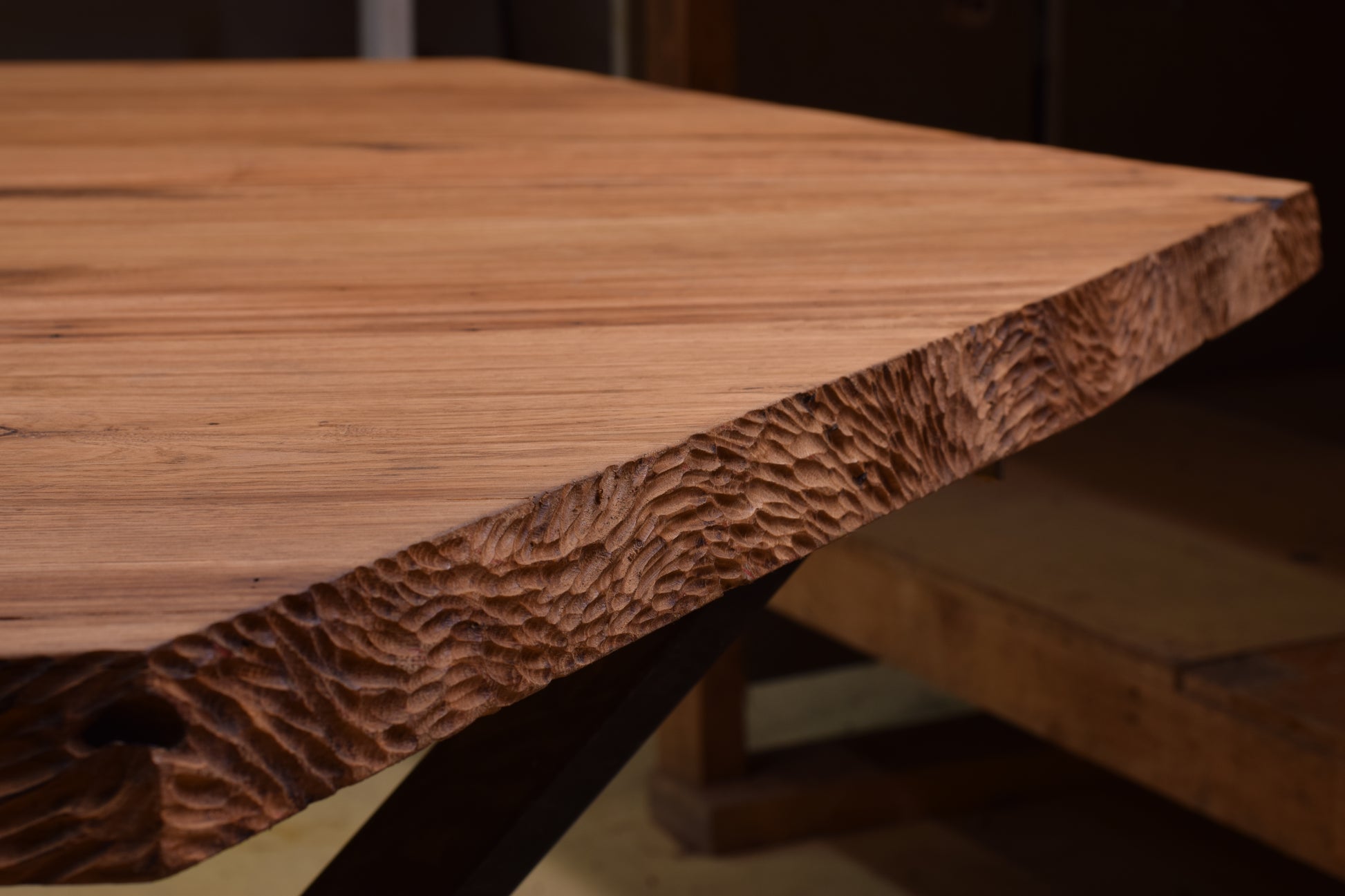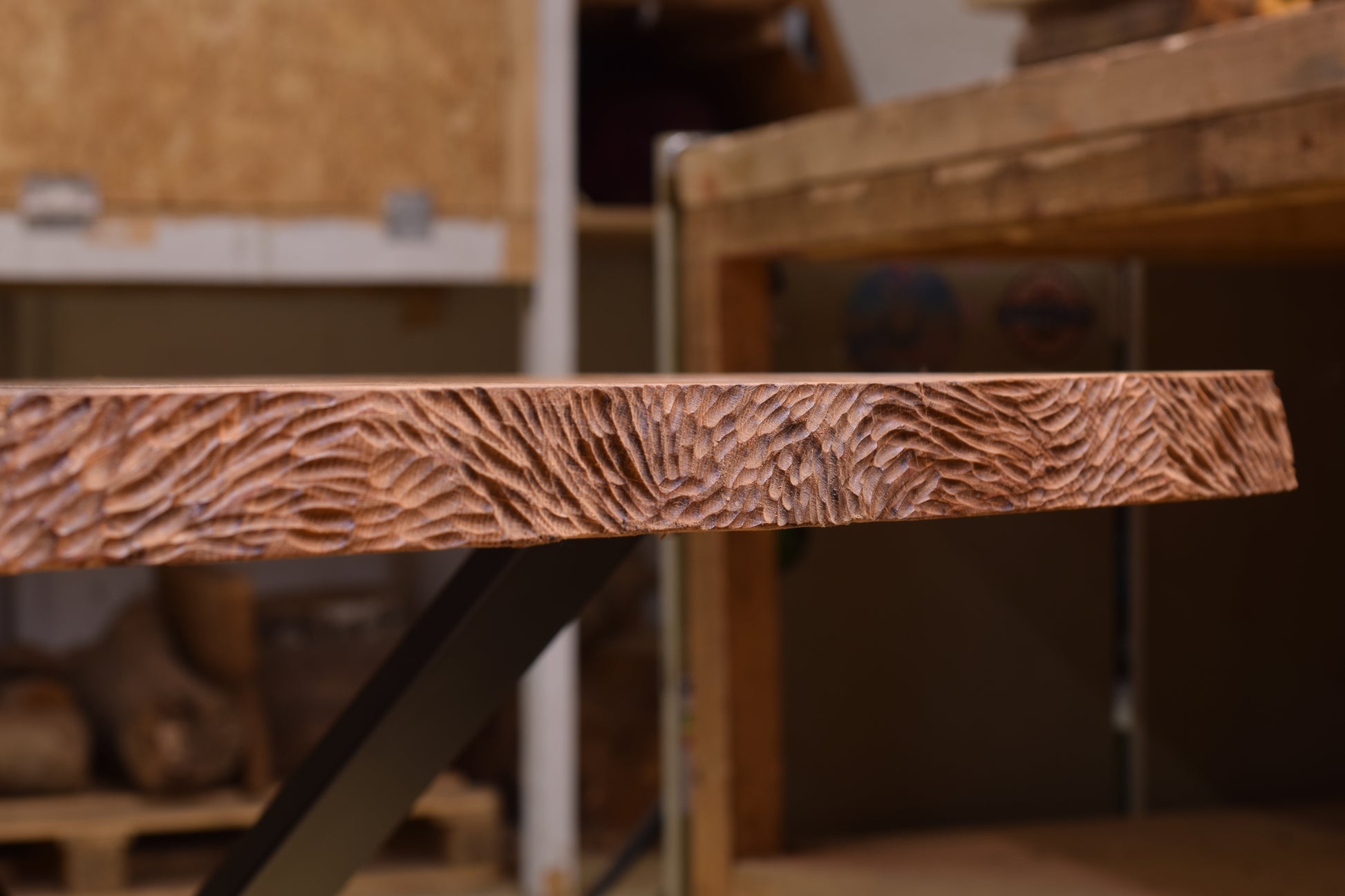 Ručno izrađena ploča za stol od masivnog hrasta, površina ploče je fino brušena dok su rubovi naglašeni s dinamičnom teksturom.