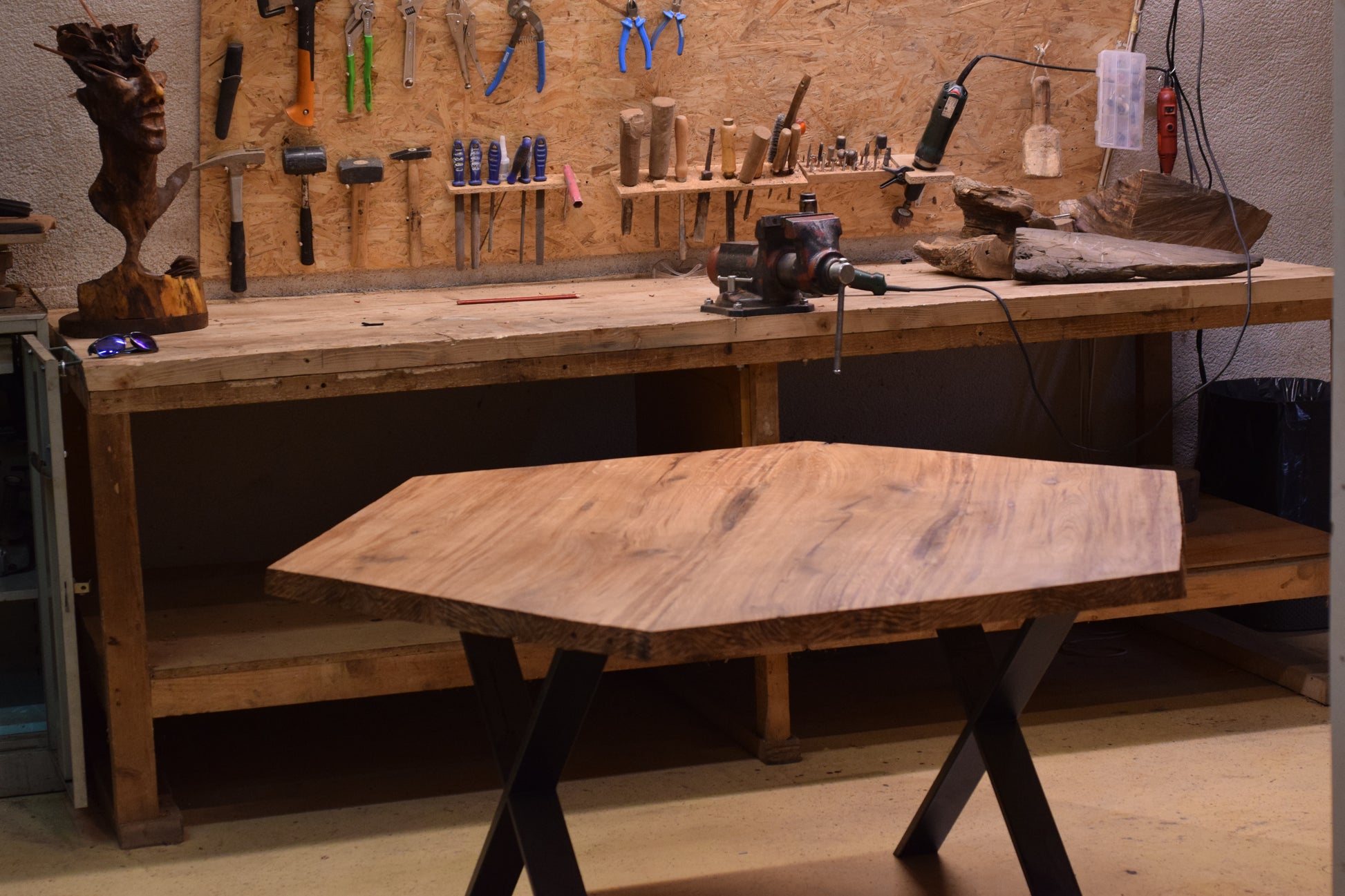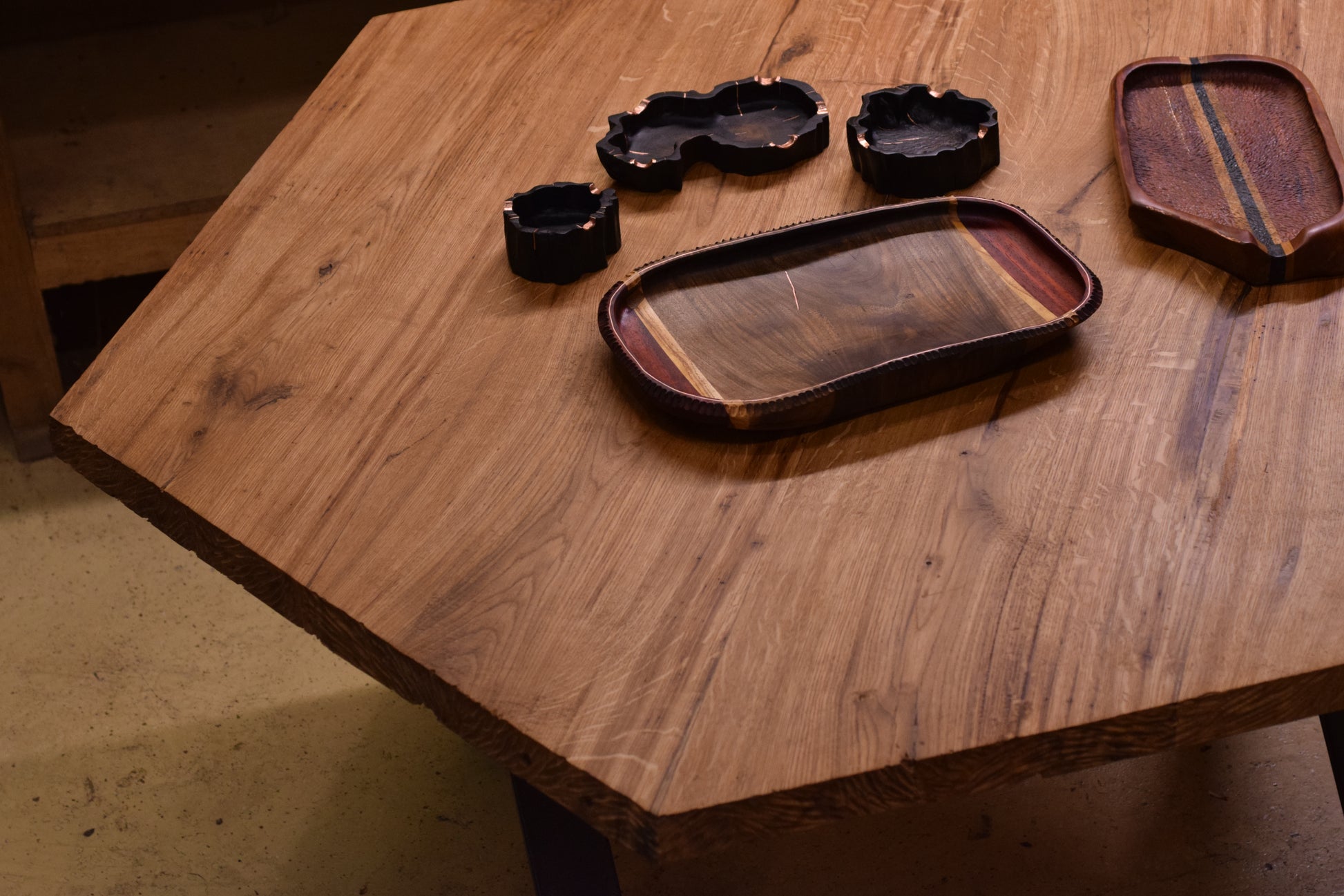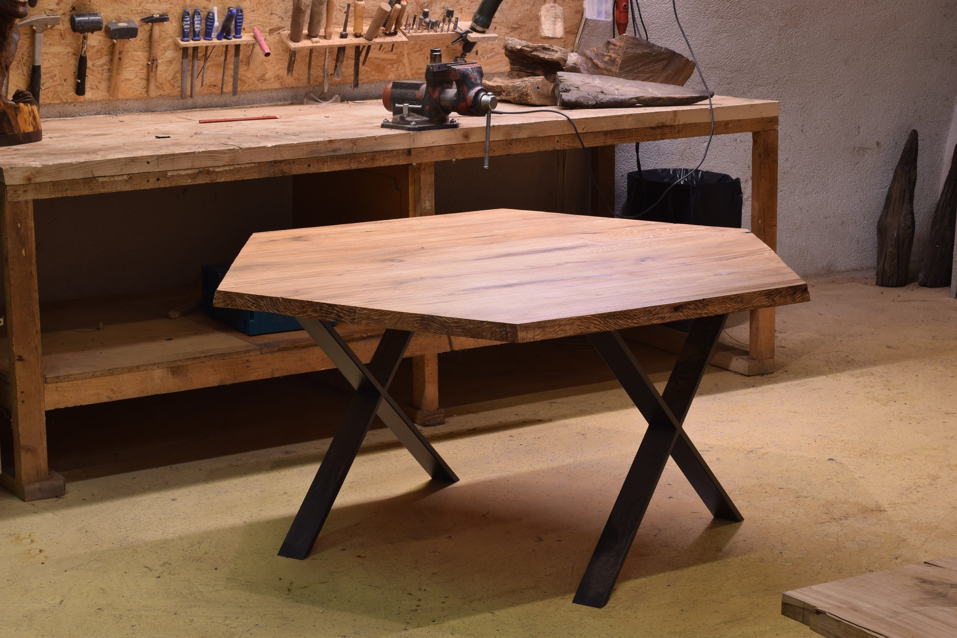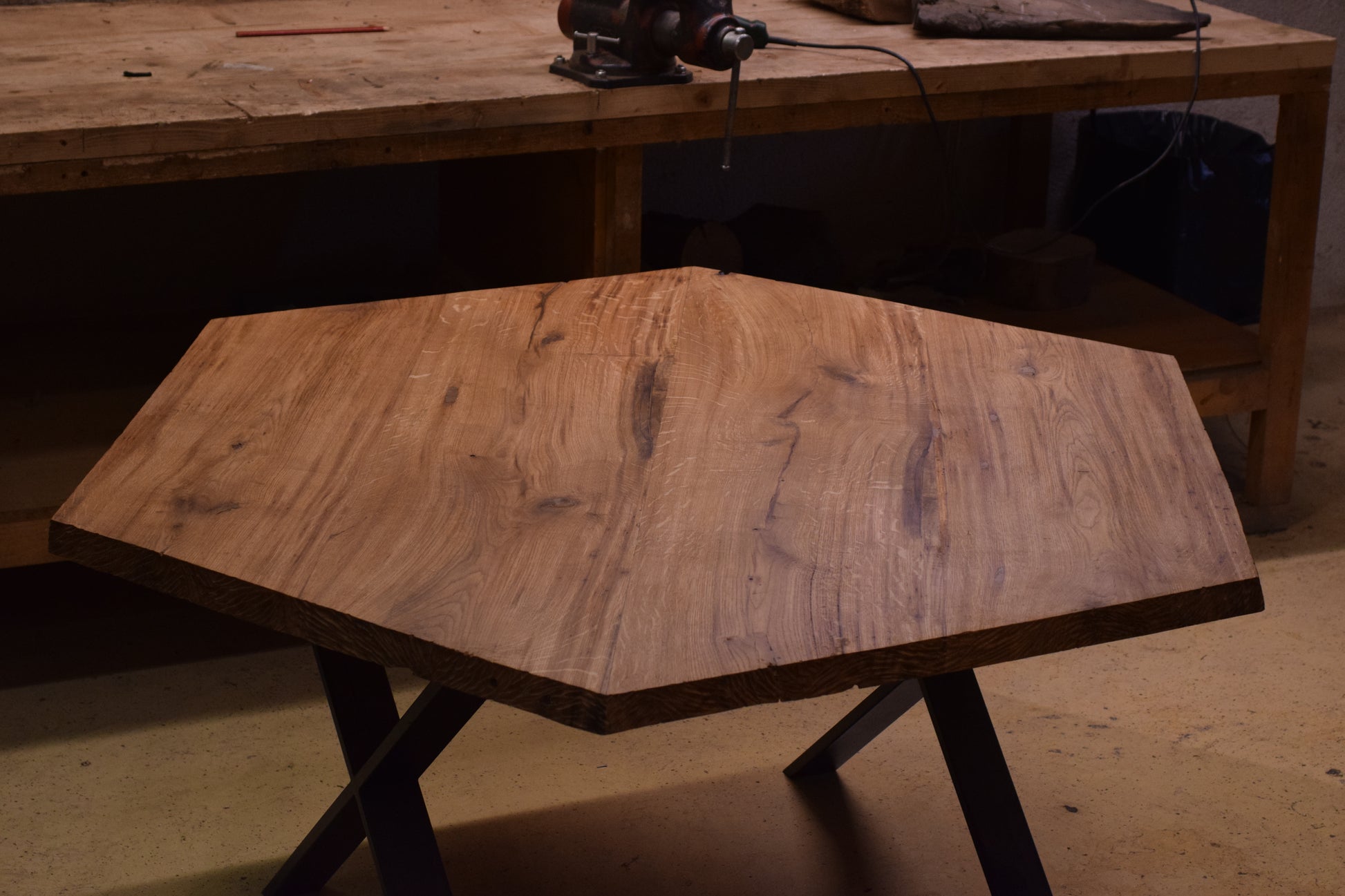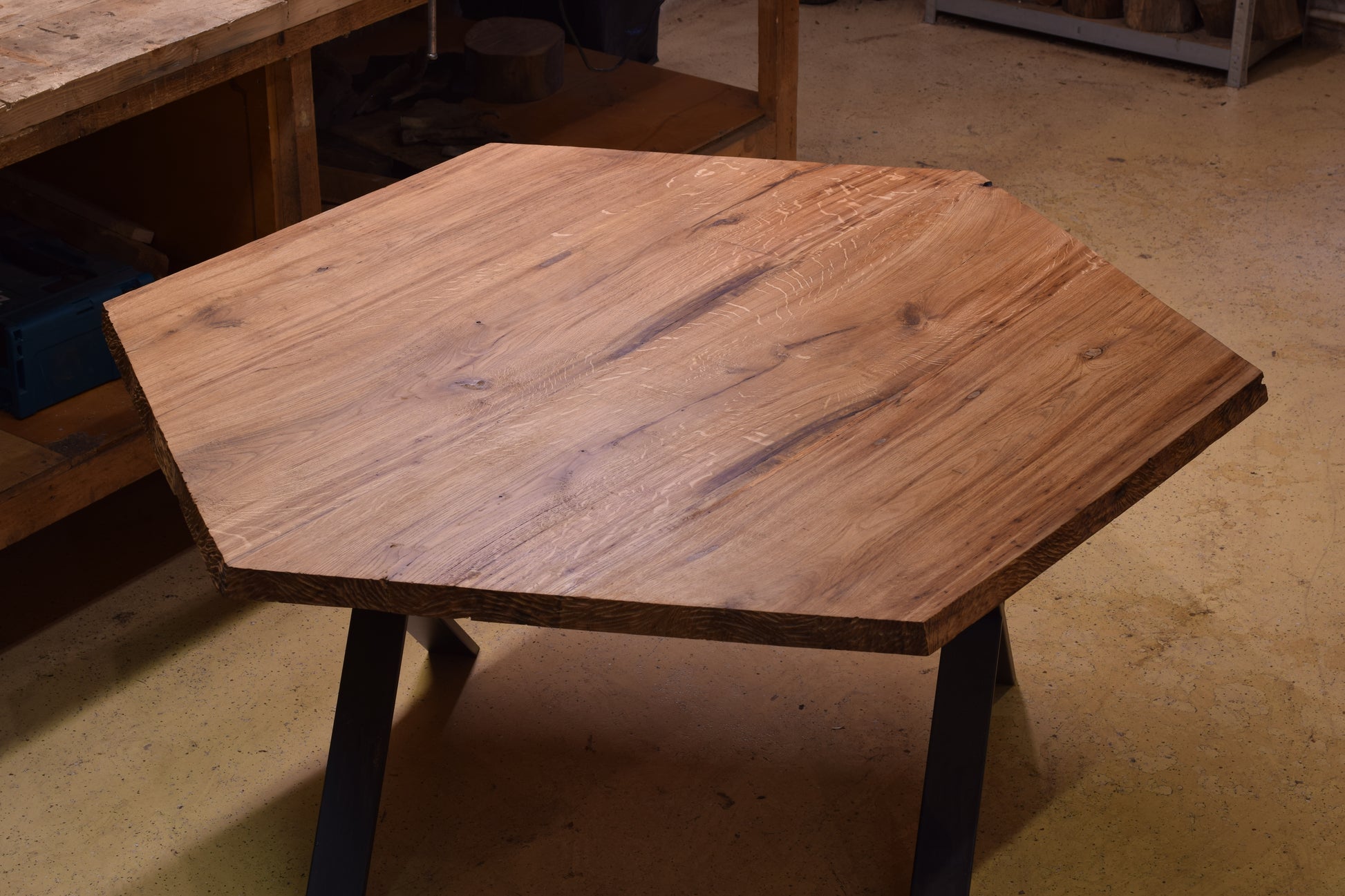 Ručno izrađena ploča za stol od masivnog hrasta, površina ploče je fino brušena dok su rubovi naglašeni s dinamičnom teksturom.