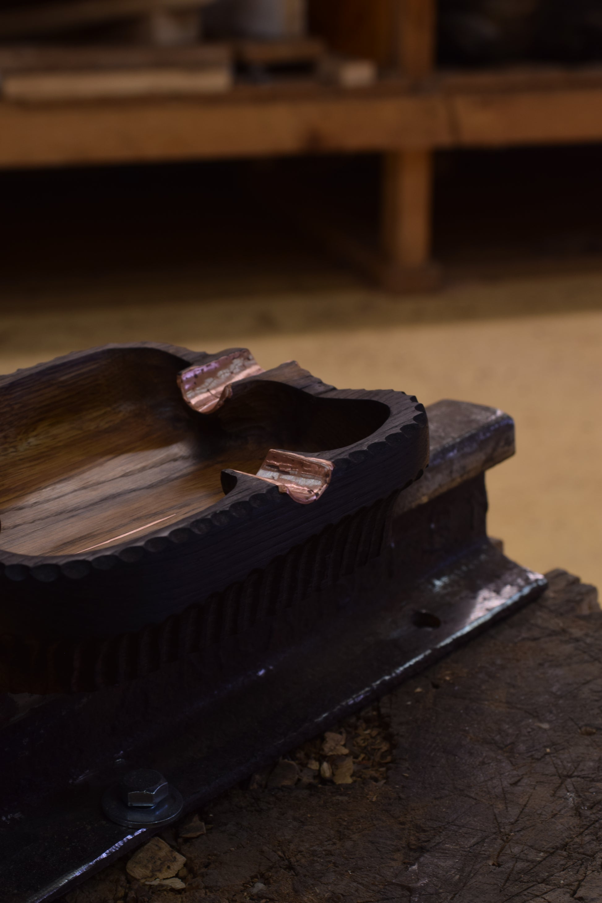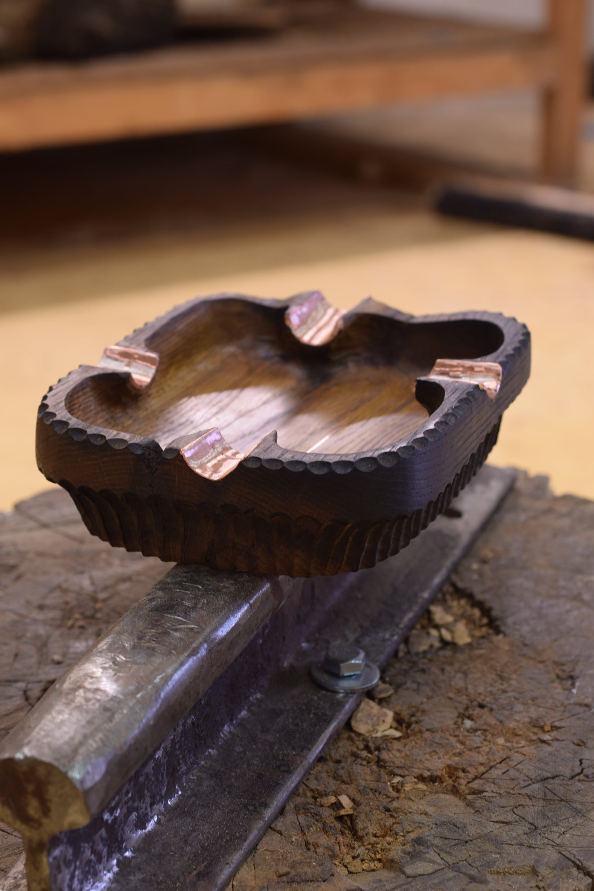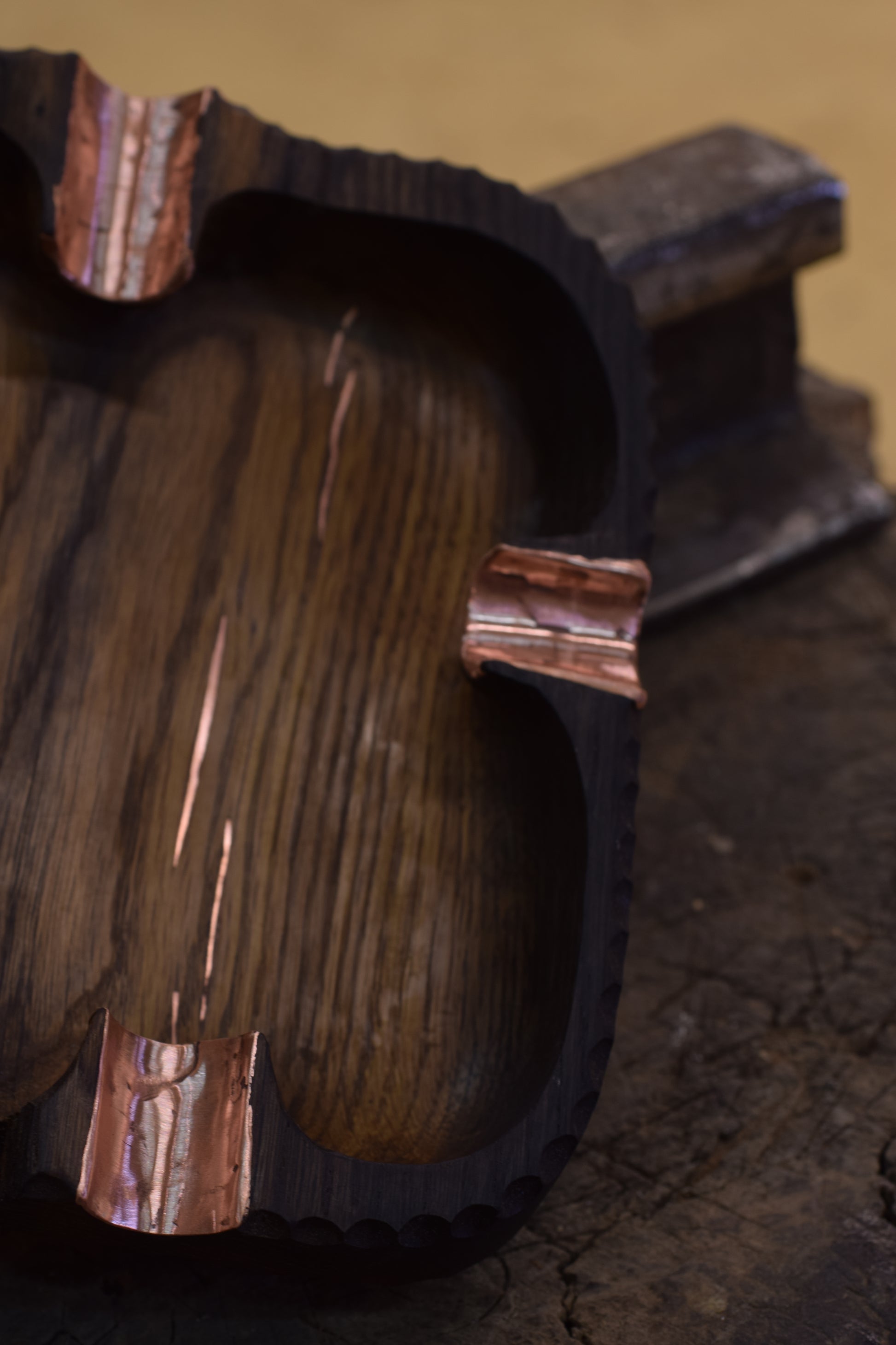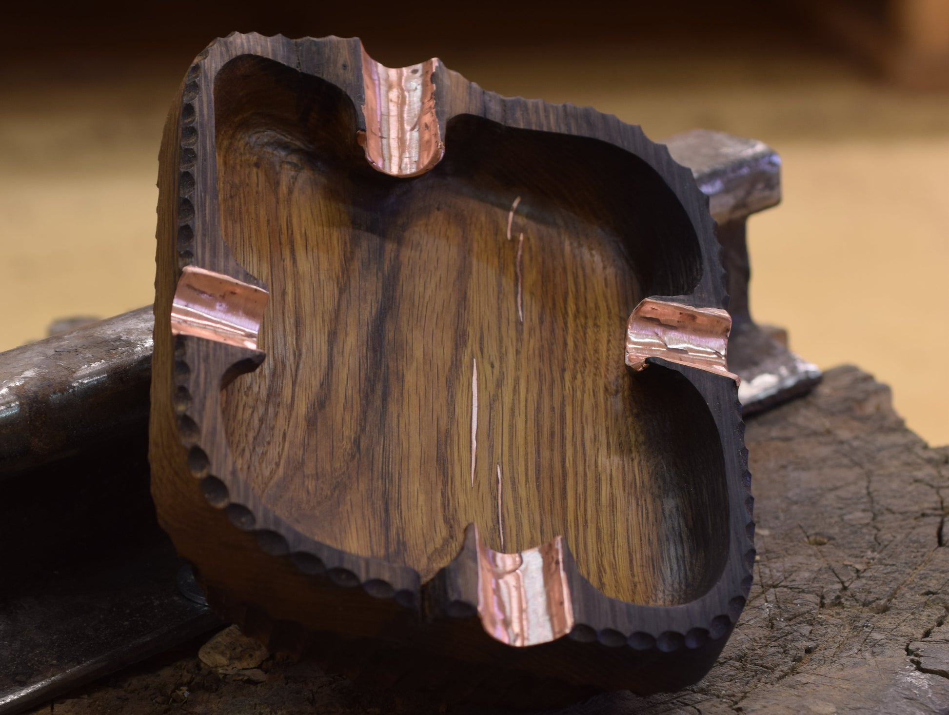 Ova ručno izrađena drvena pepeljara izrađena od močvarnog hrasta - abonosa ističe prirodni karakter i boju materijala, ukrašena raznim teksturama te bakrenim detaljima i urezima za odlaganje cigarete. Abonos je idealno drvo za izradu pepeljara, zbog svoje tvrdoće i otpornosti na visoke temperature.
