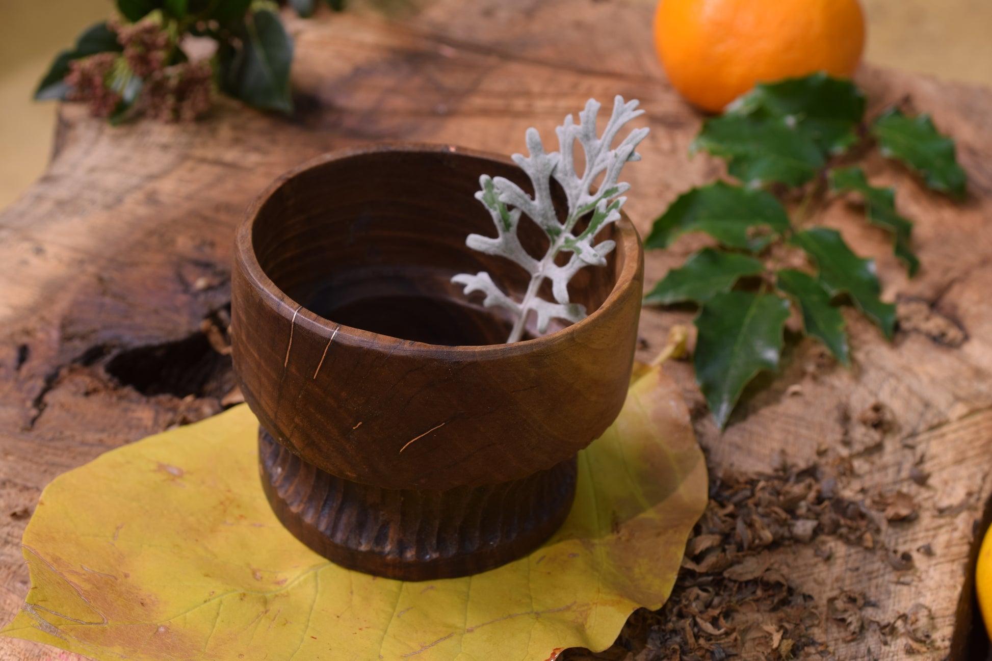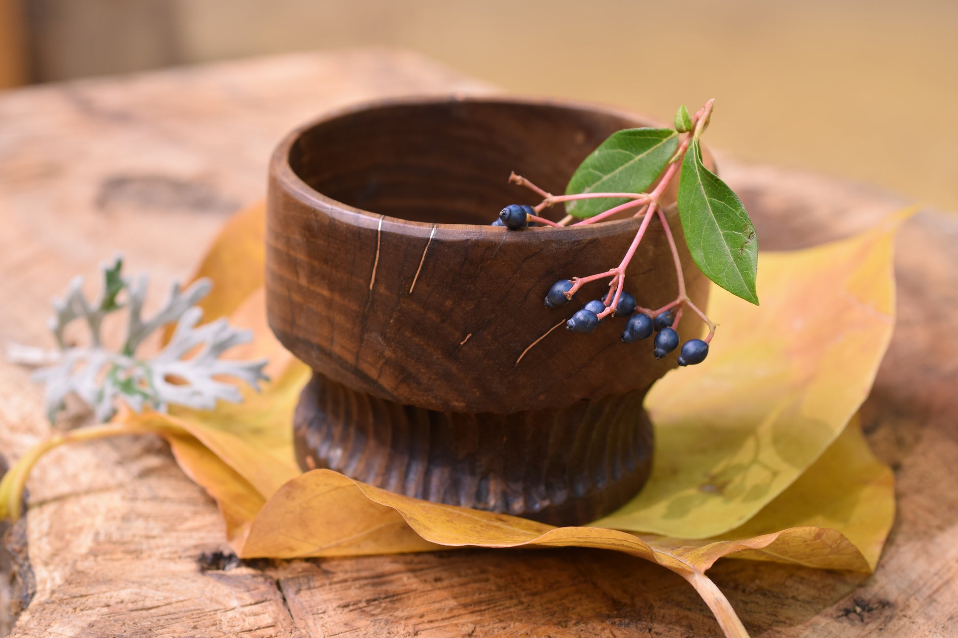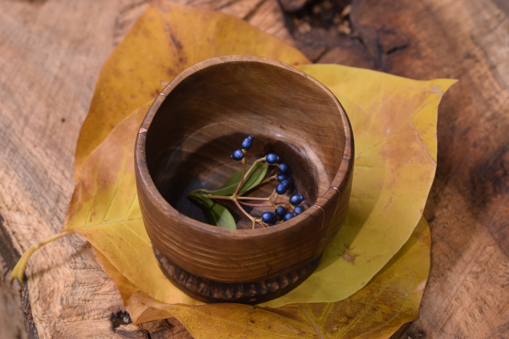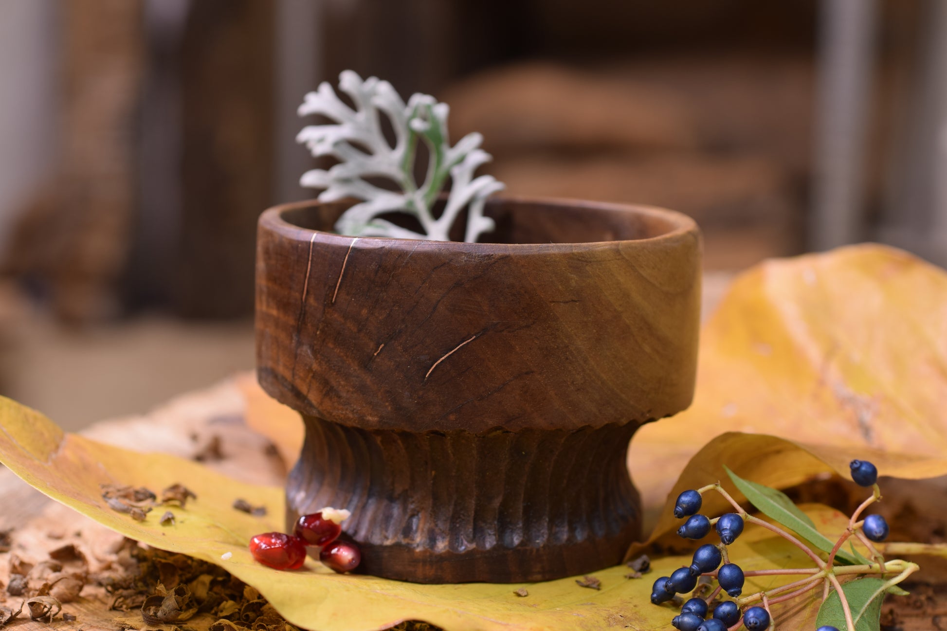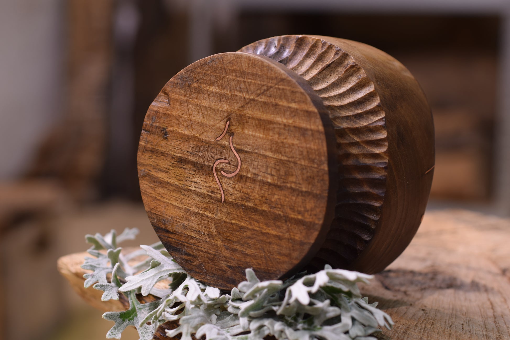 Ručno izrađena drvena posuda izrađena od oraha, te su pukotine u drvetu popunjene svjetlucavim bakrenim komadićima