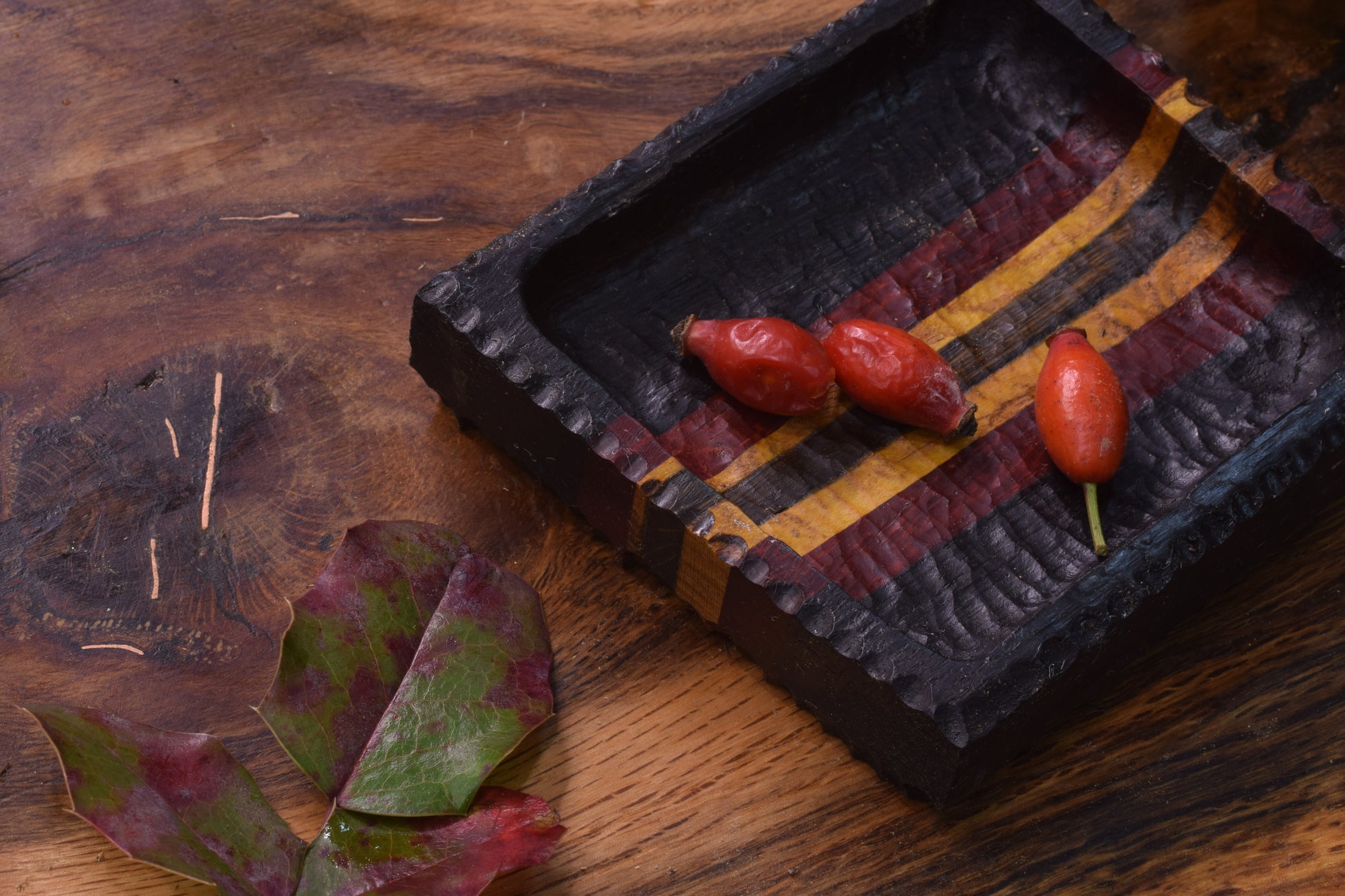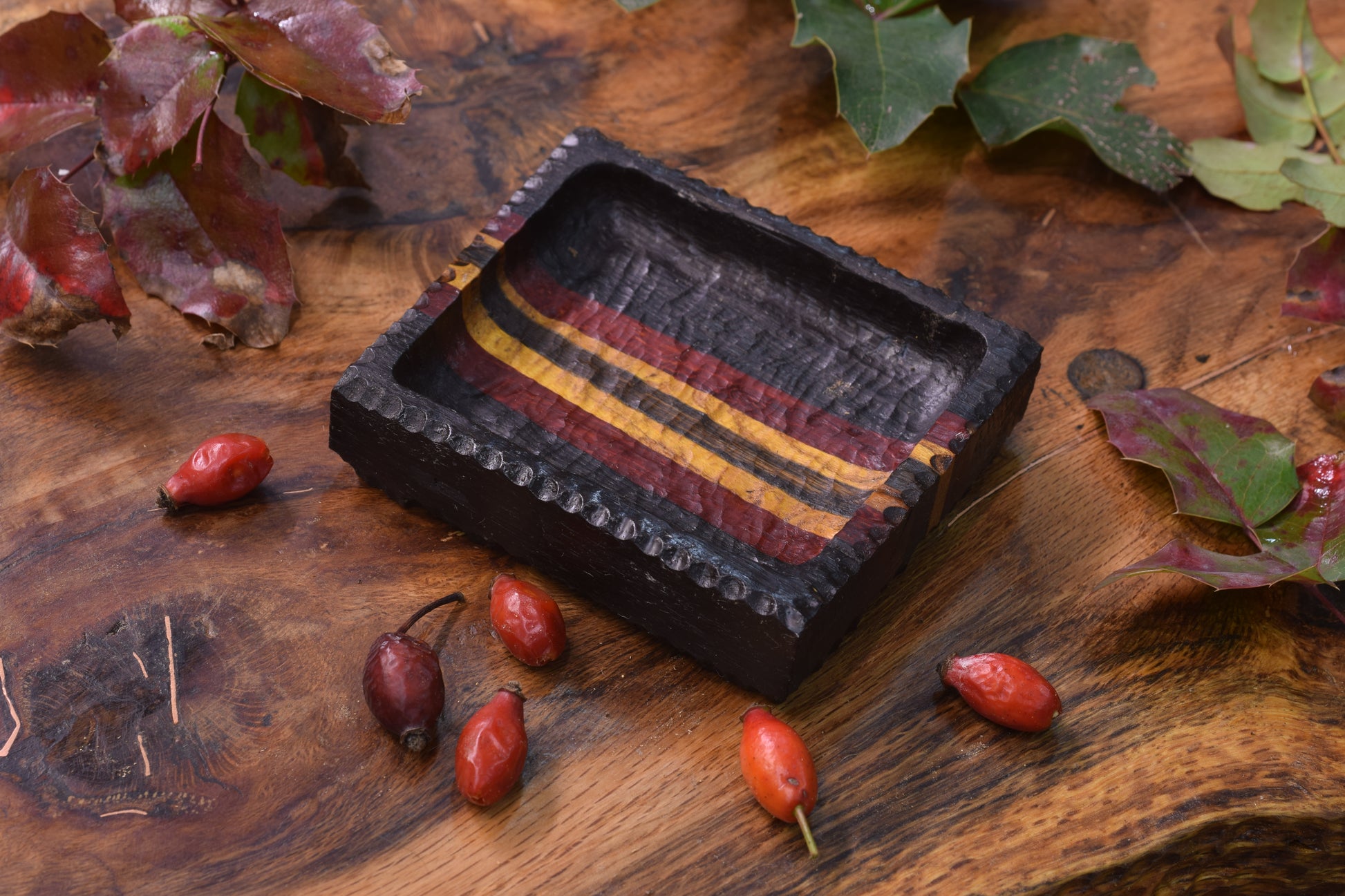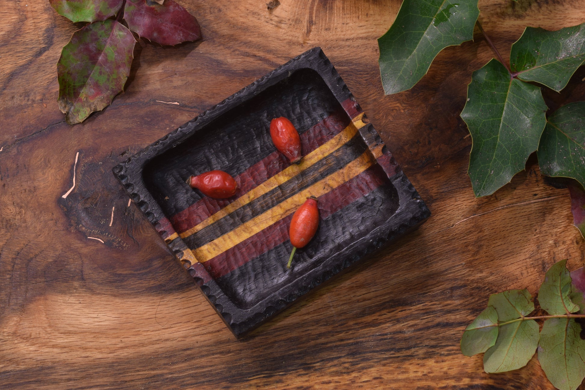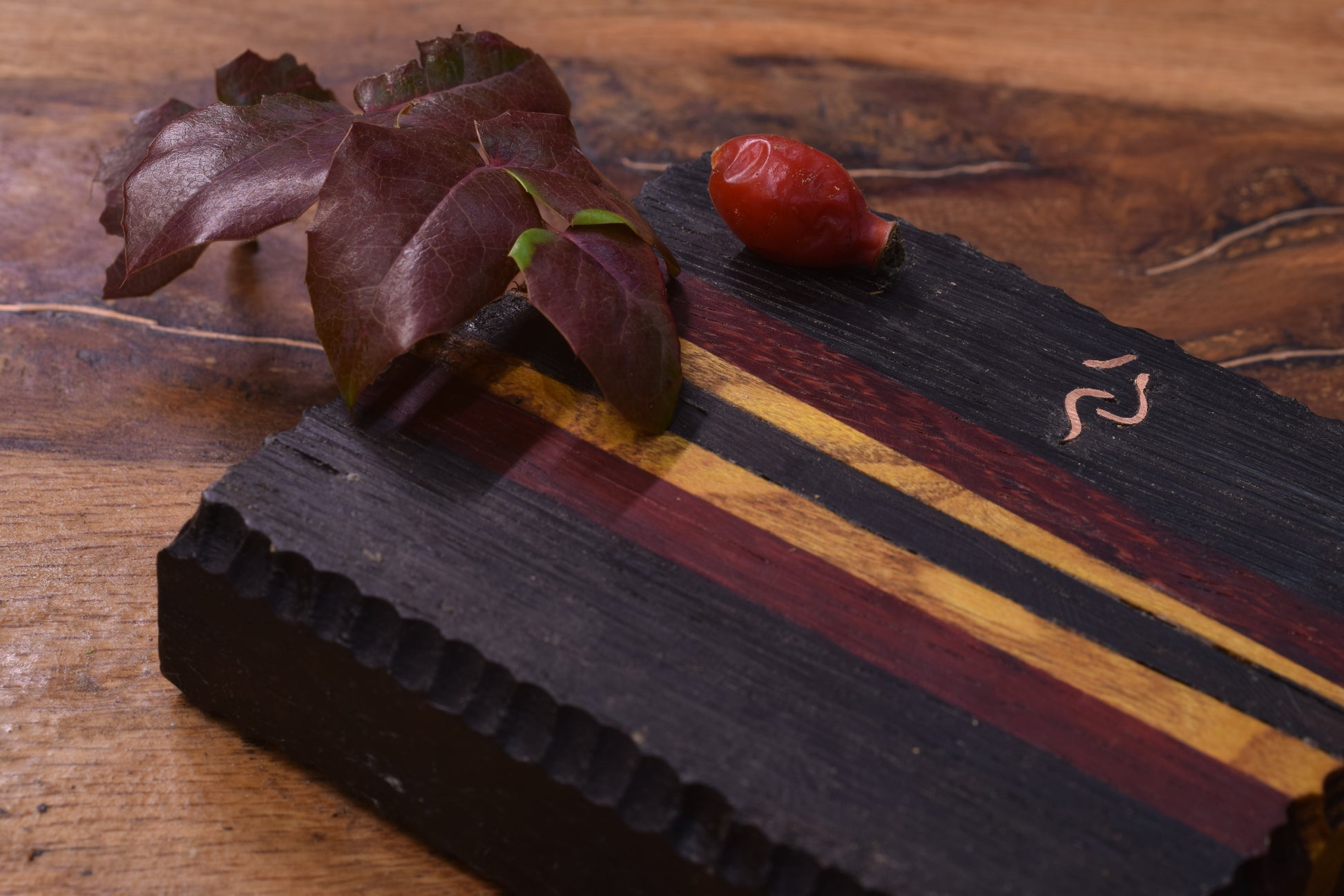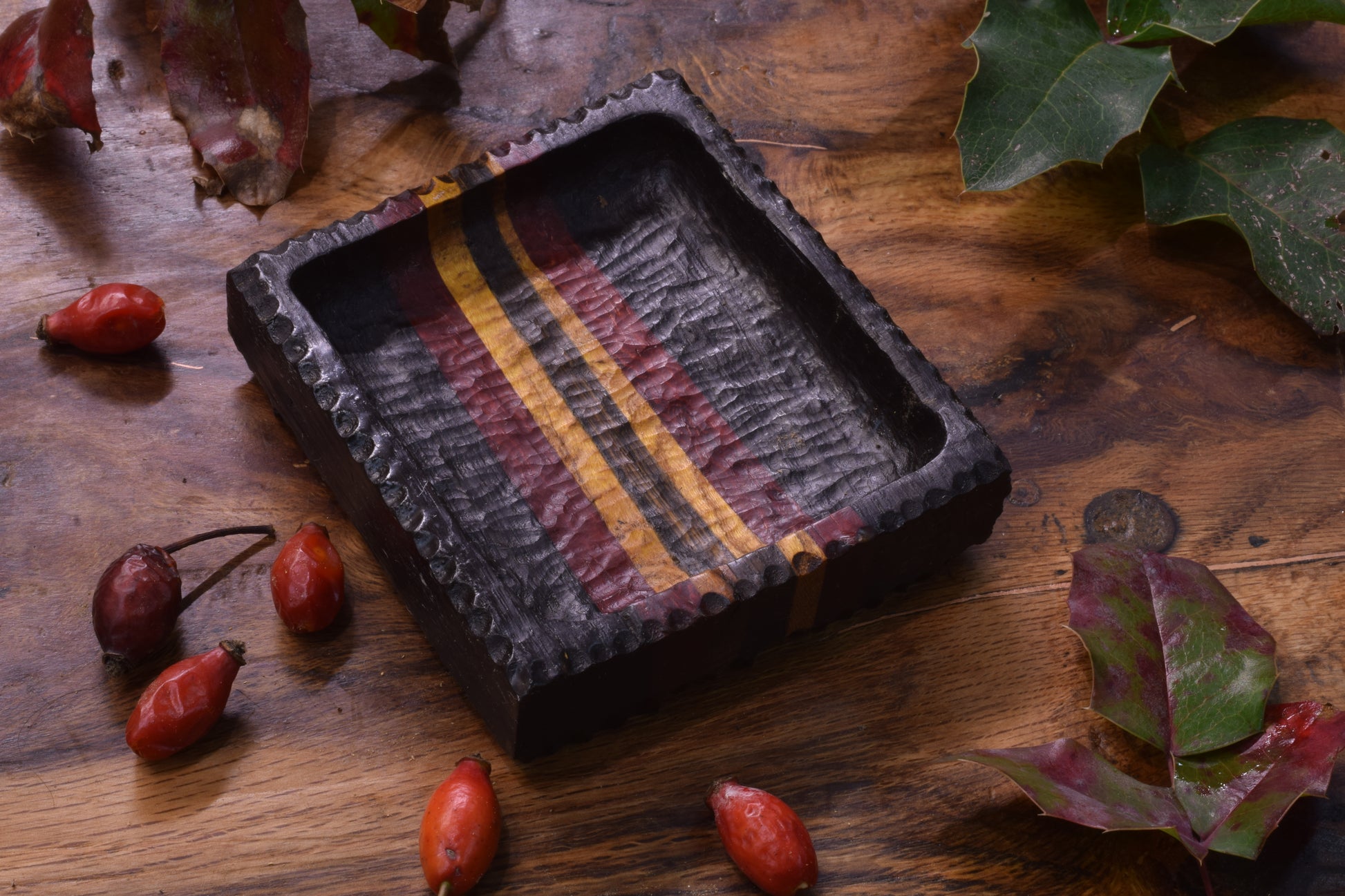 Ova ručno izrađena drvena pepeljara izrađena od raznog drveta ističe prirodni karakter materijala, ukrašena raznim teksturama te bakrenim urezima za odlaganje cigarete.